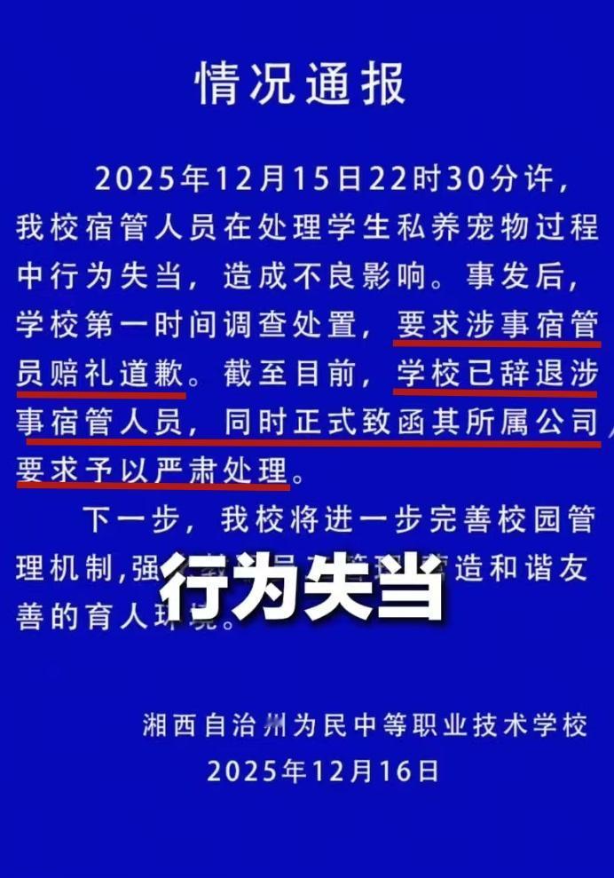 湖南“教官”摔死小猫事件有后续了。 根据学校最新发出的通报,摔死小猫的“教官”
