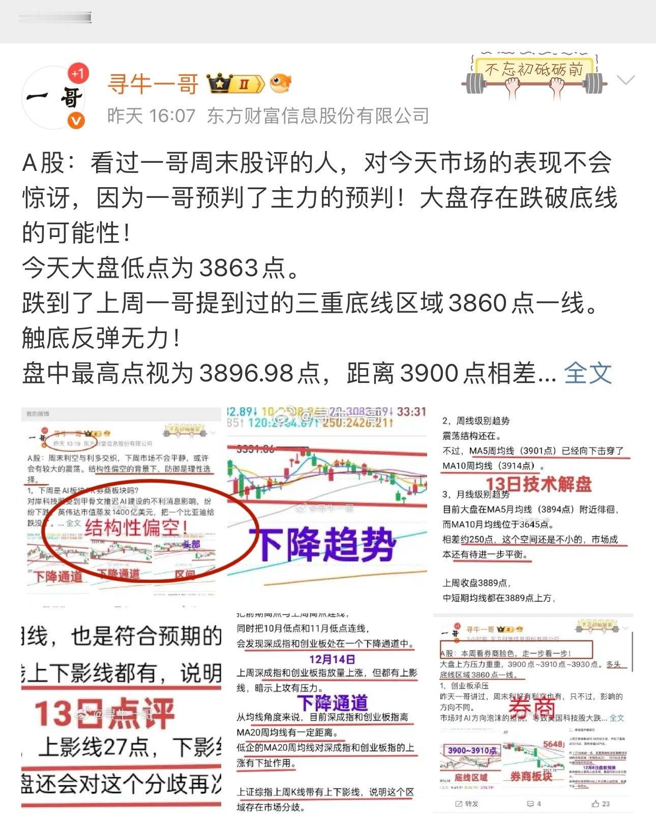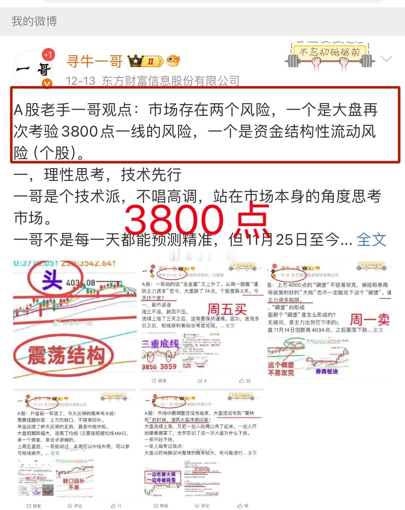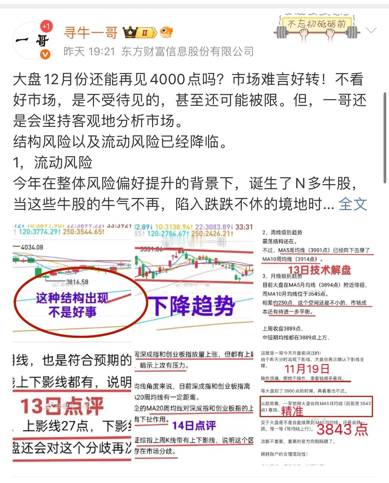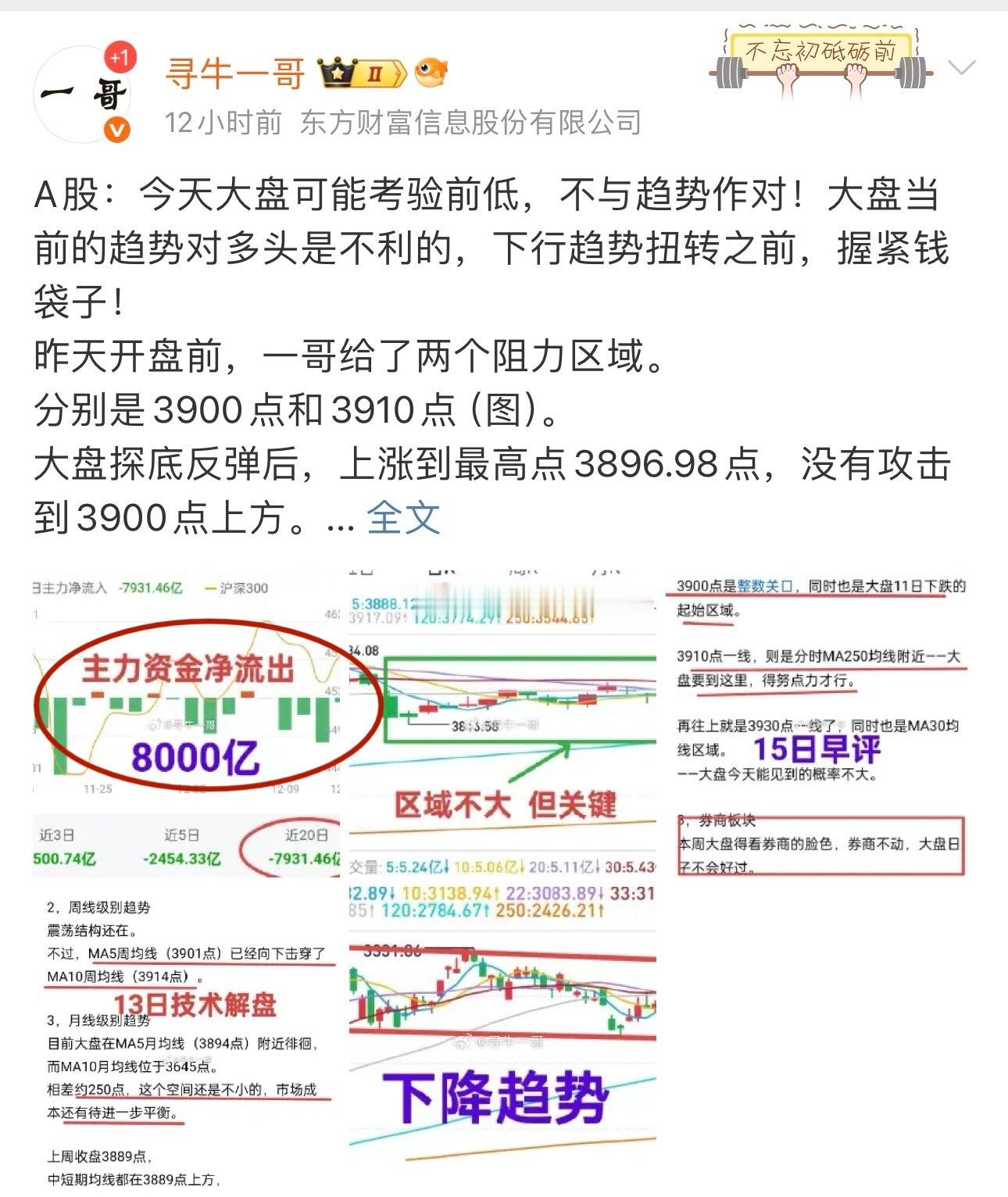 A股:大盘又到了3800点一线,符合一哥上周末的预期!市场经过二次或多次探底之后,中期底部才能真正确立!(图)12月7日的时候,一哥就提醒过,谨防大盘冲高回落。因为很多人因为利好出台,又兴奋了起来。一哥当时的观点很明确:利好可能改变中期调整的节奏,但难以从根本上改变市场趋势。12月8日(周一)大盘冲高回落,一直跌到了今天。当时,有不少人(包括一些大V)认为大盘会攻击4000点,甚至更高吧。实际上,这些人是没有看懂市场的运行趋势。早在11月29日的时候(11月24日,大盘最低3816点),一哥就表明过观点(图)。不能确定3800点一线就是中期底部!因为大盘处在中期调整状态,大盘需要时间(空间)平衡市场成本。经过二次或多次试探底线,大盘才可能真正确立中期底部。回过头来看,一哥的预测是很有前瞻性的。有些人会说一哥是马后炮。一哥要说,那是因为不懂趋势为何物。实际上,但凡看看大盘的月线级别趋势,对大盘的发展心里门清得很:1,MA5月均线远离MA10月均线。2,市场缩了量。3,大盘跌破了上升趋势线。这种情况下,对大盘抱有过高期待就是与趋势作对。一哥为什么反复强调要保持账户的合理流动性?现在,懂了吧。个人观点,仅供交流,不构成投资建议!理财有风险,投资需谨慎!郑重声明:一哥没有助理,不会主动联系任何人!大盘a股今日看盘A股指数大盘行情A股行情大盘分析行情
