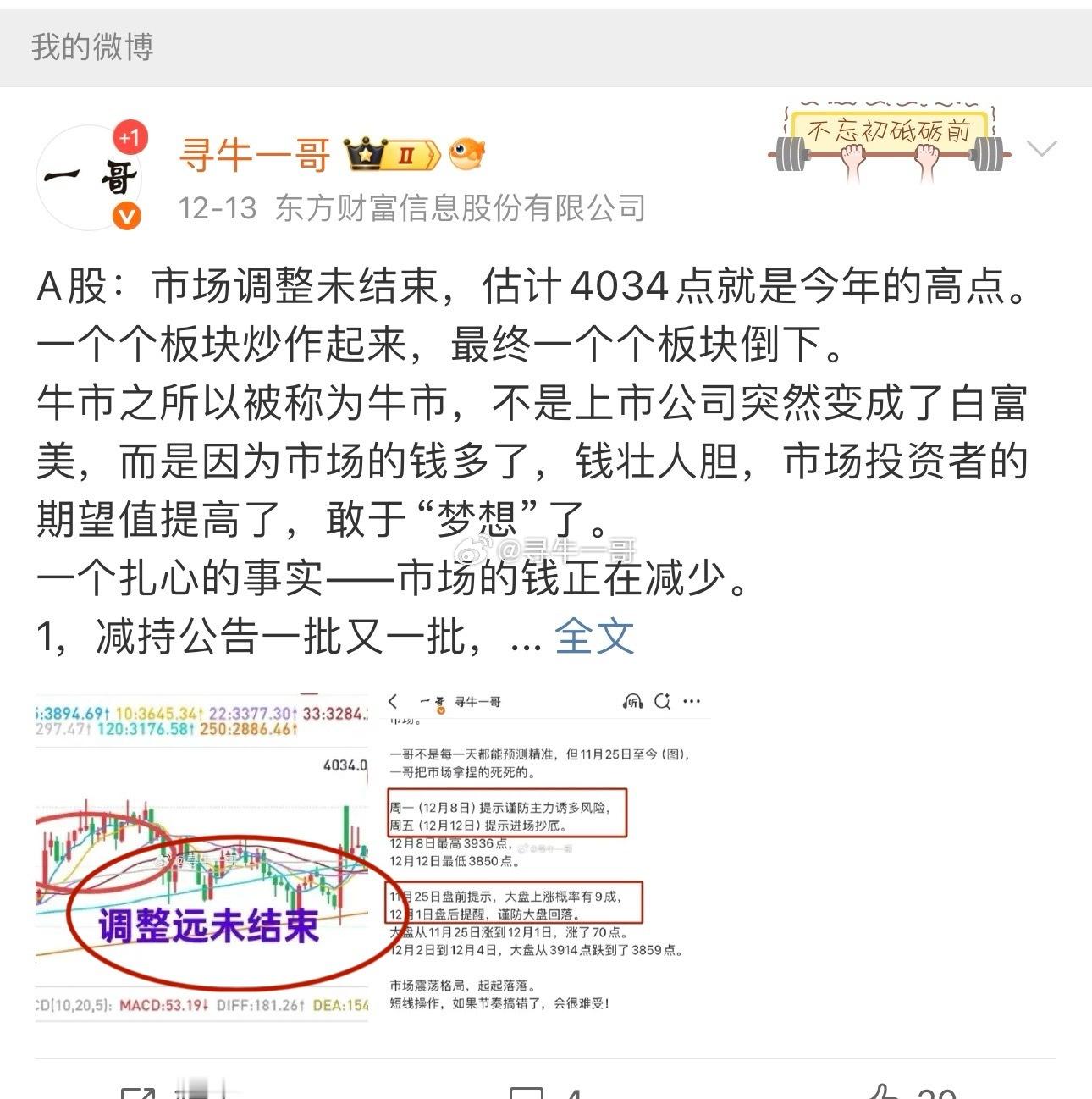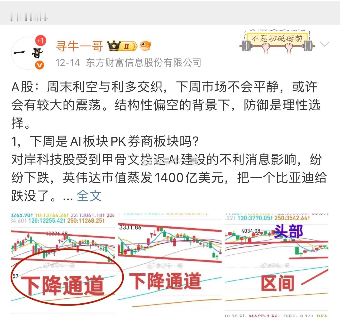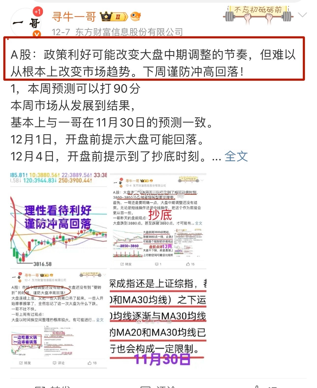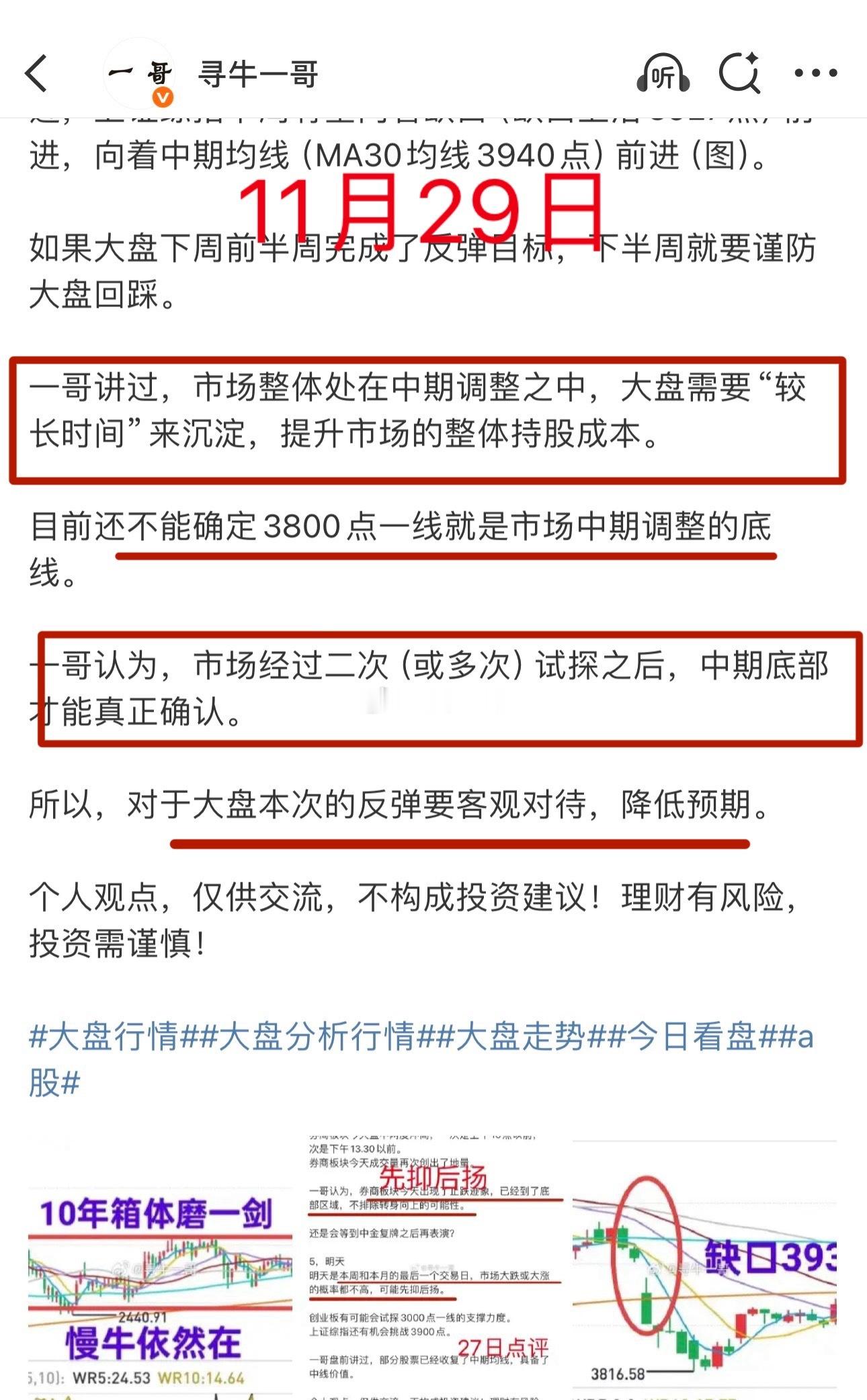 A股:大盘又到了3800点一线,符合一哥上周末的预期!市场经过二次或多次探底之后,中期底部才能真正确立!(图)12月7日的时候,一哥就提醒过,谨防大盘冲高回落。因为很多人因为利好出台,又兴奋了起来。一哥当时的观点很明确:利好可能改变中期调整的节奏,但难以从根本上改变市场趋势。12月8日(周一)大盘冲高回落,一直跌到了今天。当时,有不少人(包括一些大V)认为大盘会攻击4000点,甚至更高吧。实际上,这些人是没有看懂市场的运行趋势。早在11月29日的时候(11月24日,大盘最低3816点),一哥就表明过观点(图)。不能确定3800点一线就是中期底部!因为大盘处在中期调整状态,大盘需要时间(空间)平衡市场成本。经过二次或多次试探底线,大盘才可能真正确立中期底部。回过头来看,一哥的预测是很有前瞻性的。有些人会说一哥是马后炮。一哥要说,那是因为不懂趋势为何物。实际上,但凡看看大盘的月线级别趋势,对大盘的发展心里门清得很:1,MA5月均线远离MA10月均线。2,市场缩了量。3,大盘跌破了上升趋势线。这种情况下,对大盘抱有过高期待就是与趋势作对。一哥为什么反复强调要保持账户的合理流动性?现在,懂了吧。个人观点,仅供交流,不构成投资建议!理财有风险,投资需谨慎!郑重声明:一哥没有助理,不会主动联系任何人!大盘a股今日看盘A股指数大盘行情A股行情大盘分析行情