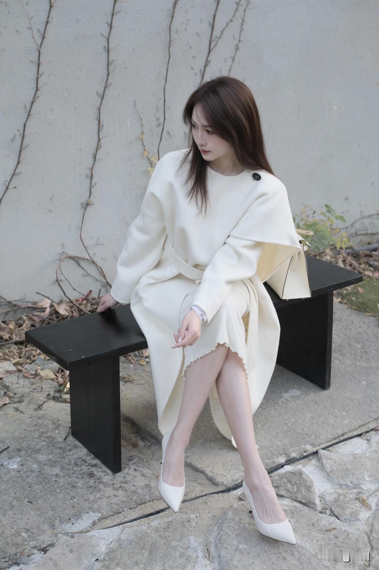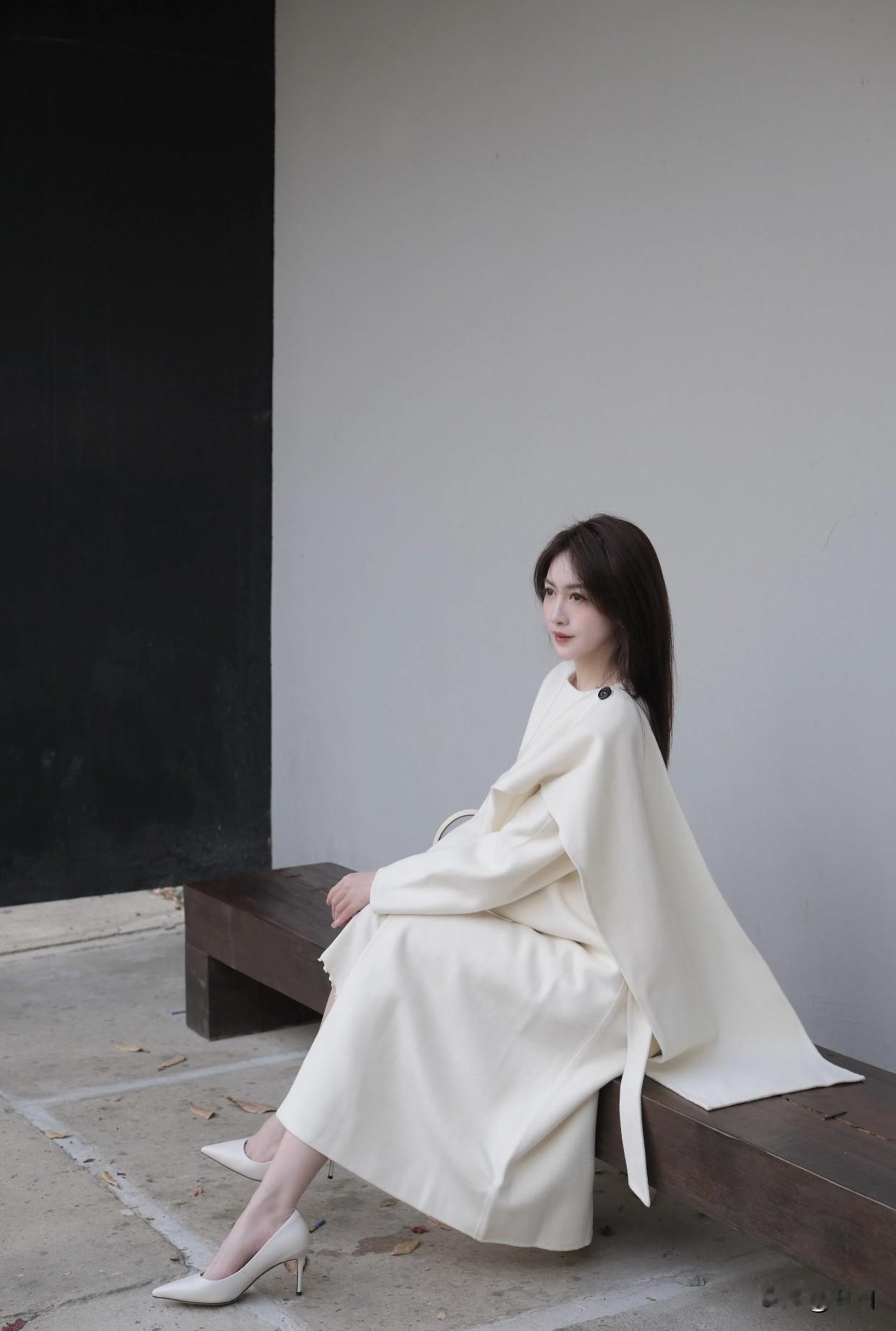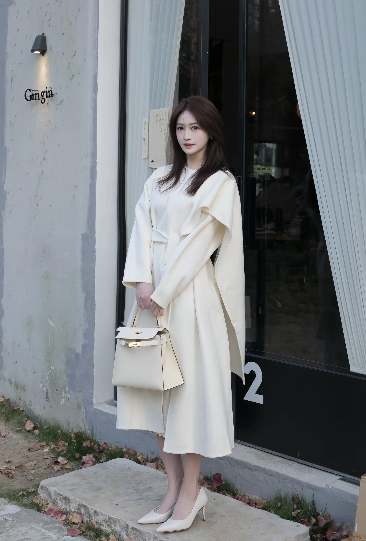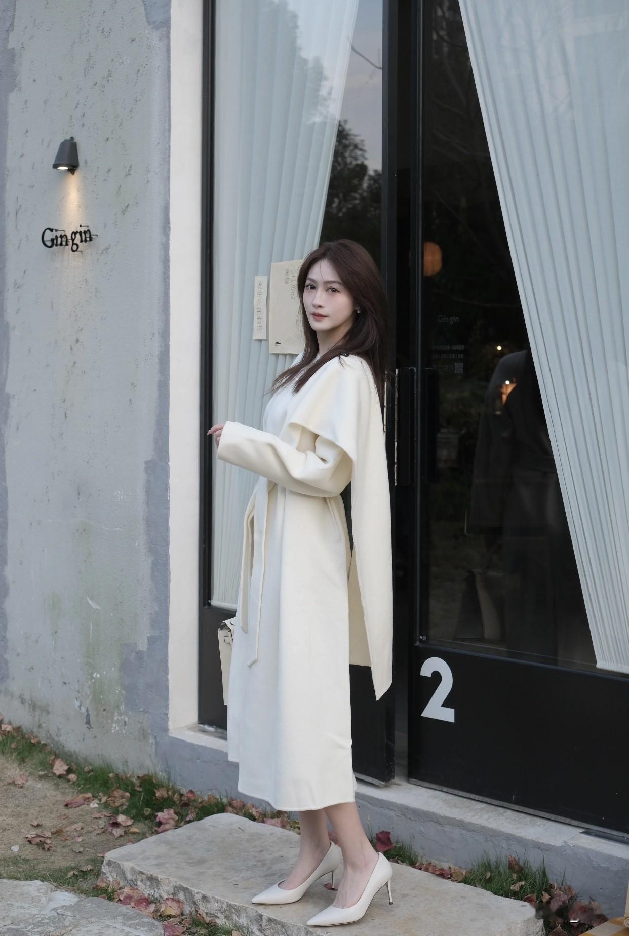 什么搭配显气质优雅白大衣,都市时尚风,Gingin咖啡馆前,秋日暖阳下。