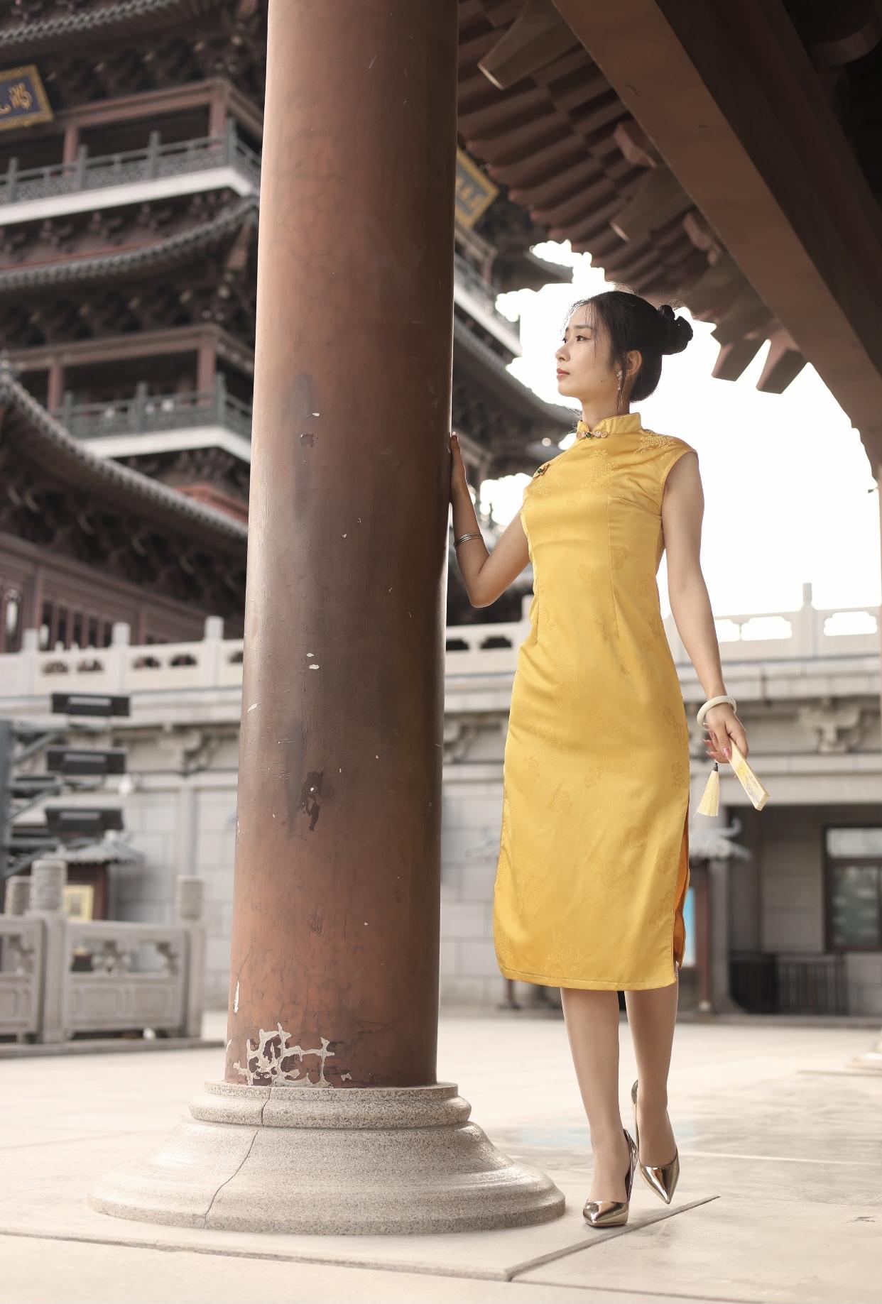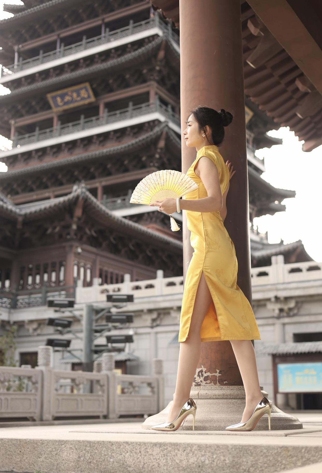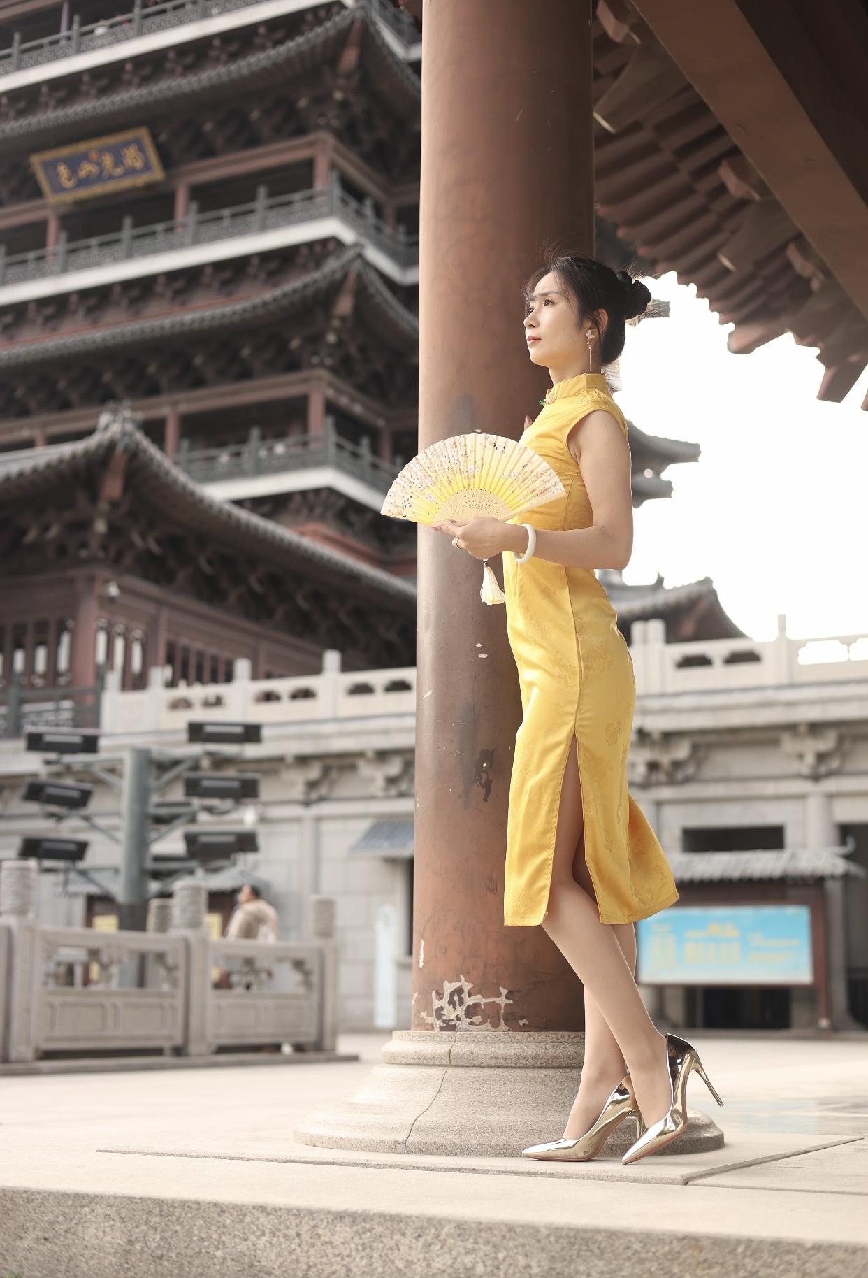 女人如何穿出含蓄的性感?古风古韵,黄衣美人倚古塔,手持团扇,韵味十足。