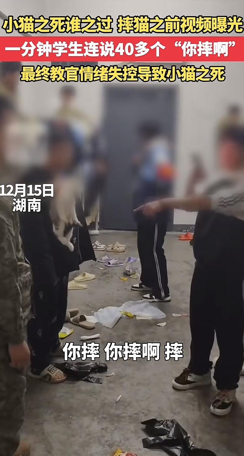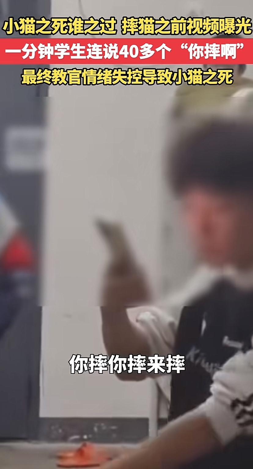 湖南湘西一职业技术学院教官“摔死猫”,反转来了。学生疯狂挑衅教官,连说40多次“你摔啊”,导致教官情绪失控,摔死小猫。 客观说,教官摔死猫肯定不对。 但学生举动更让人不堪: 1、宿舍能养宠物吗?不能。他却带猫到宿舍。 2、教官抓猫他是商量吗?不是,疯狂挑衅。 3、为什么先拿出手机录视频?已经准备“网暴教官”,教官要么妥协、要么中计。 职校,充其量起到一个“收容”之责,校内孩子绝大多数不自律、不服管教。游戏成瘾、好吃懒做、我行我素。学习,只有极少量孩子会幡然悔悟、奋发图强。 视频中,可以看看宿舍的地面,脏的不堪入目。是不是可以印证“懒”这一点呢? 我不养宠物,但也尊重宠物生命。宠物生命的长短是主人给予的,而不是别人、更不是宠物自己。 就像“杀狗”、“毒狗”一个道理,你的宠物“侵犯人权”了。而本事件中,你的宠物“违背学校规则”了。 讨伐教官,不如反思学生的暴戾吧,对吗? 职校教官摔猫事件该如何处理 你认为湘西学校教官摔猫谁对谁错 教官摔猫全怪教官合理吗