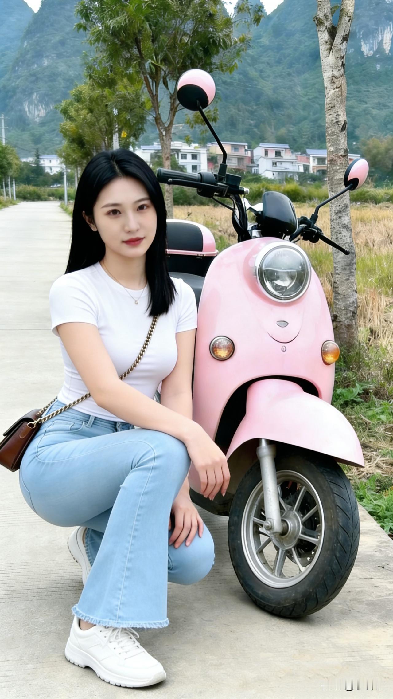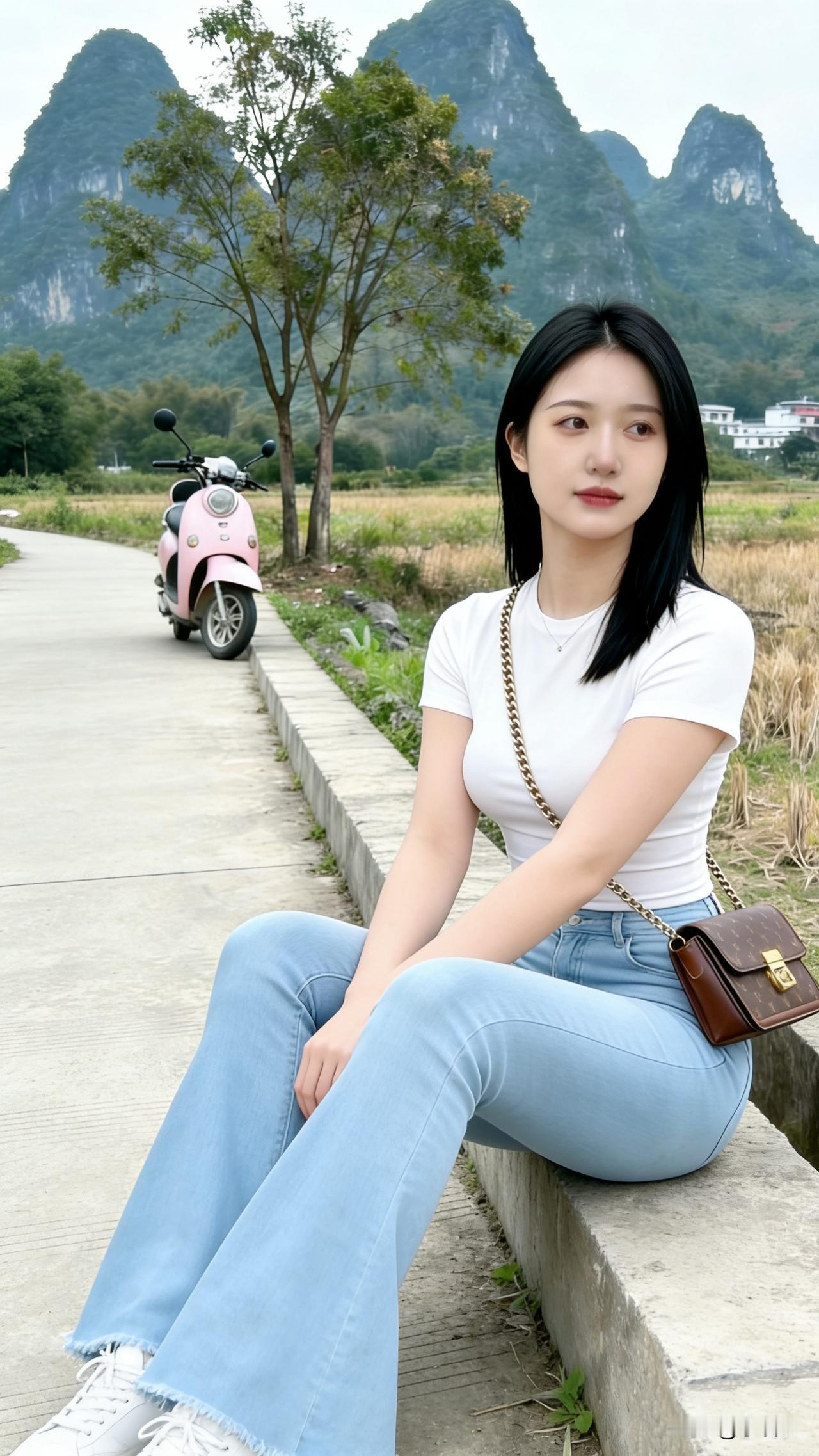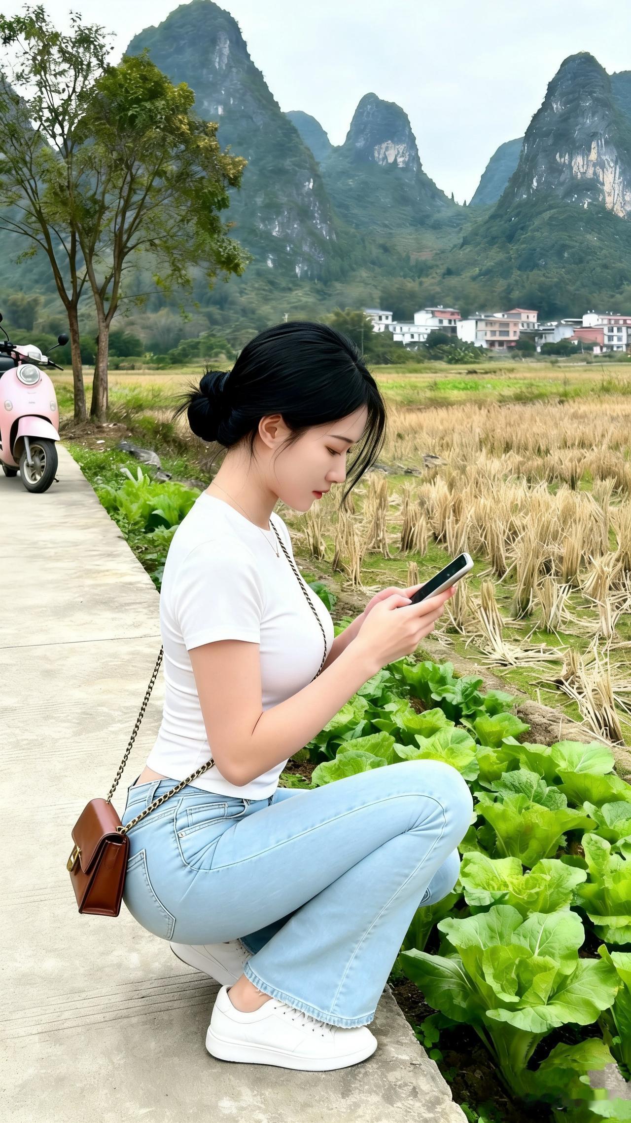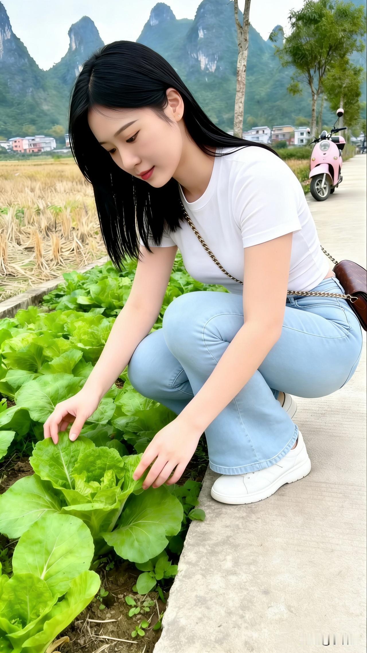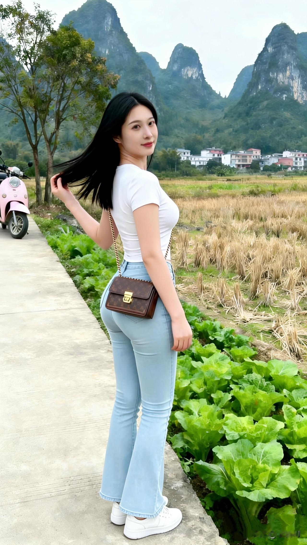 《郊野行吟》 峰如黛墨列晴空,田陌风轻翠意融。 粉骑斜依村径侧,青衿闲立菜畦东。 素衫漫卷山间气,阔裤轻承陌上风。 纤手拈蔬凝睇久,柔荑抚叶醉眸濛。 回身笑指千峰秀,信步徐行一径通。 云影悠悠遮峻岭,莺声隐隐入芳丛。 人间自有清欢处,不羡瑶台阆苑中。 黛发轻扬随步履,芳心暗契自然融。 此身暂寄烟霞里,逸兴遄飞意未穷。