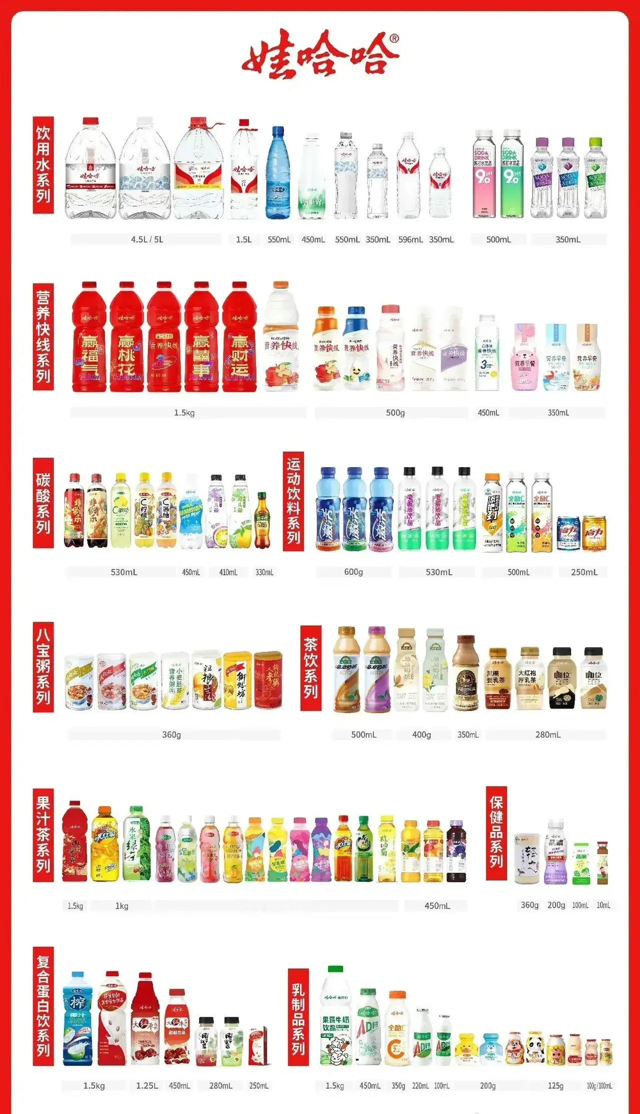 娃哈哈大家族产品。 没想到有这么多的产品系列。全部喝过的有多少人呢? 纯净水系列大家应该都接触过,八宝粥和AD钙奶肯定都喝过。 其他的接触最多的应该就是营养快线了。 值得一提的是,启力竟然也是娃哈哈旗下的。