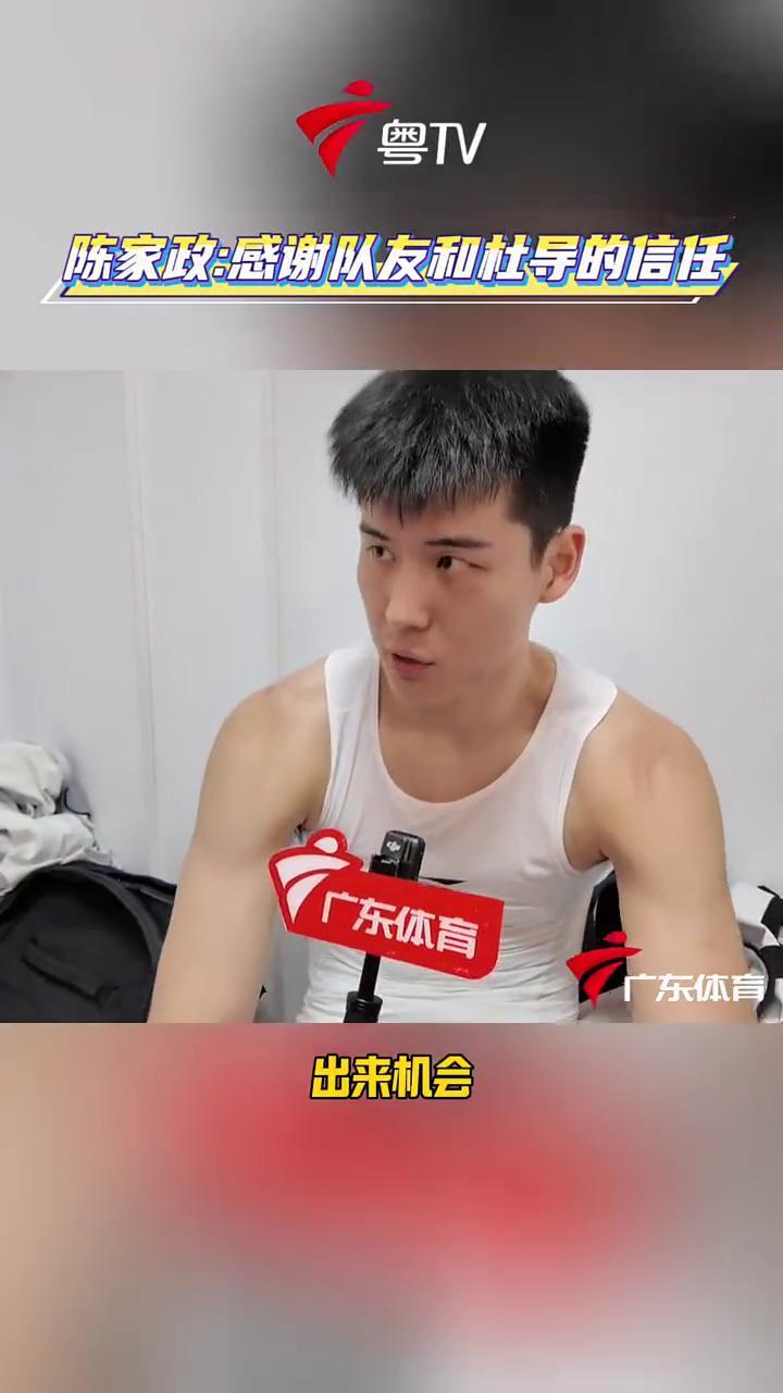 陈家政:感谢队友和杜导的信任。 广东东阳光队球员陈家政。 首先感谢杜导(杜锋)给予我机会,在场上做好防守,出来机会,哥们也相信我,第一个球没投可能就有点犹豫。杜导一直跟我说他们给我创造机会,要大胆去投篮,杜导也相信我,队友也相信我,所以还是感谢队友,感谢杜导。