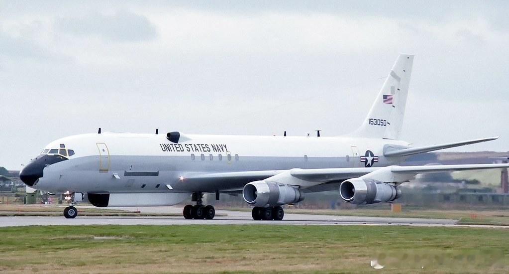1992年3月美国海军EC-24A电子战机。这是DC-8军用版本,代号EC-24A。请注意机身前部下方排列的独特天线阵列及电子吊舱。该机最初交付联合航空公司时注册号为N8048U,服役至1984年。1987年被海军购入原属联合航空的DC-8-54(F)作为电子战训练平台。这架飞机于1998年10月退役,这是海军唯一采购的该型号飞机 军事历史全触达
