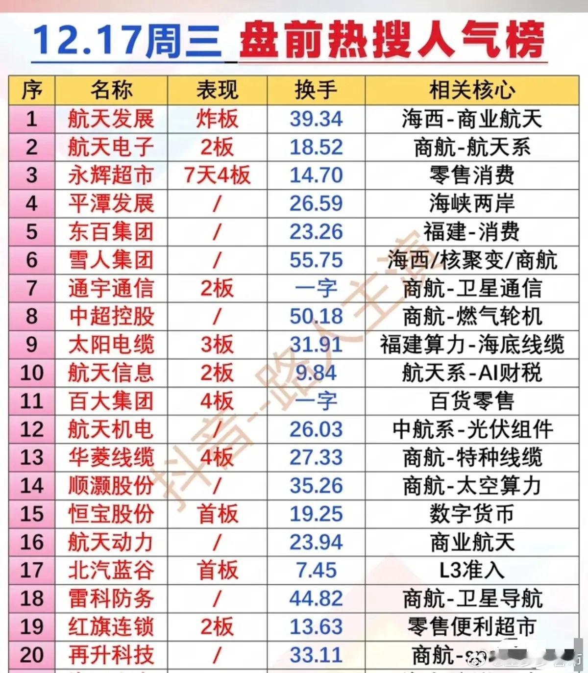 12.17盘前热搜人气榜梳理!今日热搜核心主线聚焦海西/商业航天、商航产业链、消费零售、L3自动驾驶四大方向;个股换手差异显著,雪人集团换手55.75%居首,通宇通信等个股为一字板无换手数据;涨停板数从首板到7天4板不等,题材联动性强,航天系、消费零售板块连板标的集中度较高。个股梳理分析1. 航天发展:表现炸板,换手39.34%,核心为海西-商业航天。炸板反映资金分歧,高换手体现交投活跃,商业航天有政策催化,但短期收益受分歧影响,需关注后续回封力度与板块联动。2. 航天电子:2板走势,换手18.52%,核心商航-航天系。两连板彰显资金认可,航天系与商航题材联动性强,低换手说明筹码锁定好,短期收益具备延续性预期,可看板块助攻。3. 永辉超市:7天4板,换手14.70%,核心零售消费。消费复苏背景下走出连板,低换手体现筹码稳定,零售赛道业绩改善预期支撑收益,连板趋势下短期仍有溢价空间。4. 平潭发展:无明确板型,换手26.59%,核心海峡两岸。海西题材关联标的,换手适中反映资金关注度一般,题材偏区域属性,收益弹性依赖板块整体联动,短期表现偏震荡。5. 东百集团:无明确板型,换手23.26%,核心福建-消费。福建本地消费标的叠加海西题材,换手体现资金参与度中等,消费赛道修复为收益基础,短期随板块轮动为主。6. 雪人集团:无明确板型,换手55.75%,核心海西/核聚变/商航。榜单最高换手,多题材叠加吸引资金博弈,核聚变+商航的稀缺性带来收益弹性,但高换手也意味着分歧大,需看资金承接。7. 通宇通信:2板一字无换手,核心商航-卫星通信。一字板体现资金抢筹,卫星通信是商航核心分支,题材稀缺性高,一字板下筹码未充分交换,开板后收益看资金承接力度。8. 中超控股:无明确板型,换手50.18%,核心商航-燃气轮机。商航产业链细分标的,高换手反映资金博弈激烈,燃气轮机技术壁垒为收益支撑,短期震荡中或有波段机会。9. 太阳电缆:3板走势,换手31.91%,核心福建算力-海底线缆。三连板叠加双题材,换手适中体现资金接力积极,算力+线缆细分赛道稀缺,推动短期收益持续,可看连板高度。10. 航天信息:2板走势,换手9.84%,核心航天系-AI财税。两连板且低换手,航天系叠加AI财税跨界题材,AI财税新赛道打开收益空间,筹码锁定好利于短期溢价延续。11. 百大集团:4板一字无换手,核心百货零售。一字四连板凸显消费零售强势,线下复苏预期强烈,筹码高度锁定,开板前收益具备确定性溢价,关注开板时机。12. 航天机电:无明确板型,换手26.03%,核心中航系-光伏组件。中航系+光伏组件跨界标的,换手反映资金参与度一般,光伏组件业绩改善为收益基础,短期随光伏板块轮动。13. 华菱线缆:4板走势,换手27.33%,核心商航-特种线缆。四连板成商航特种线缆龙头,换手适中体现资金接力顺畅,特种线缆配套属性支撑短期收益延续性。14. 顺灏股份:无明确板型,换手35.26%,核心商航-太空算力。商航+太空算力新颖题材,换手体现资金关注度较高,前沿属性带来收益弹性,短期受题材热度驱动。15. 恒宝股份:首板走势,换手19.25%,核心数字货币。数字货币首板标的,低换手说明筹码锁定好,数字经济政策催化下,首板后短期有溢价预期,看题材后续发酵。16. 航天动力:无明确板型,换手23.94%,核心商业航天。商业航天纯正标的,换手体现资金参与度中等,收益关键看板块联动,短期随商业航天题材轮动。17. 北汽蓝谷:首板走势,换手7.45%,核心L3准入。L3自动驾驶准入首板标的,极低换手体现筹码稳定,汽车智能化政策突破支撑收益,首板后溢价预期较强。18. 雷科防务:无明确板型,换手44.82%,核心商航-卫星导航。商航卫星导航标的,高换手反映资金博弈,卫星导航是商航核心环节,短期震荡中或有波段收益机会。19. 红旗连锁:2板走势,换手13.63%,核心零售便利超市。零售消费两连板标的,低换手体现筹码锁定,社区零售业绩稳健性为收益基础,短期随消费板块延续溢价。20. 再升科技:无明确板型,换手33.11%,核心商航-spaceX。商航与SpaceX概念结合,换手体现资金参与度较高,产业链联动带来收益想象空间,短期受题材热度影响。总结这些个股收益逻辑分化明显:连板且低换手的消费、航天系标的短期溢价确定性更高,一字板标的收益依赖开板后的资金承接;高换手的商航细分题材标的弹性大但分歧也大,需关注资金博弈结果;区域题材标的收益则更多依赖板块整体联动,整体需结合题材热度与筹码结构判断收益空间。本文涉及资讯、数据等内容来自网络公共信息,仅供参考,不构成投资建议!
