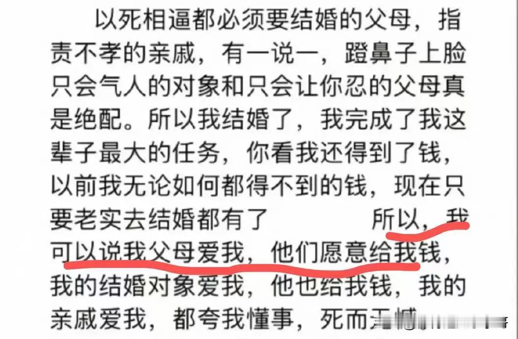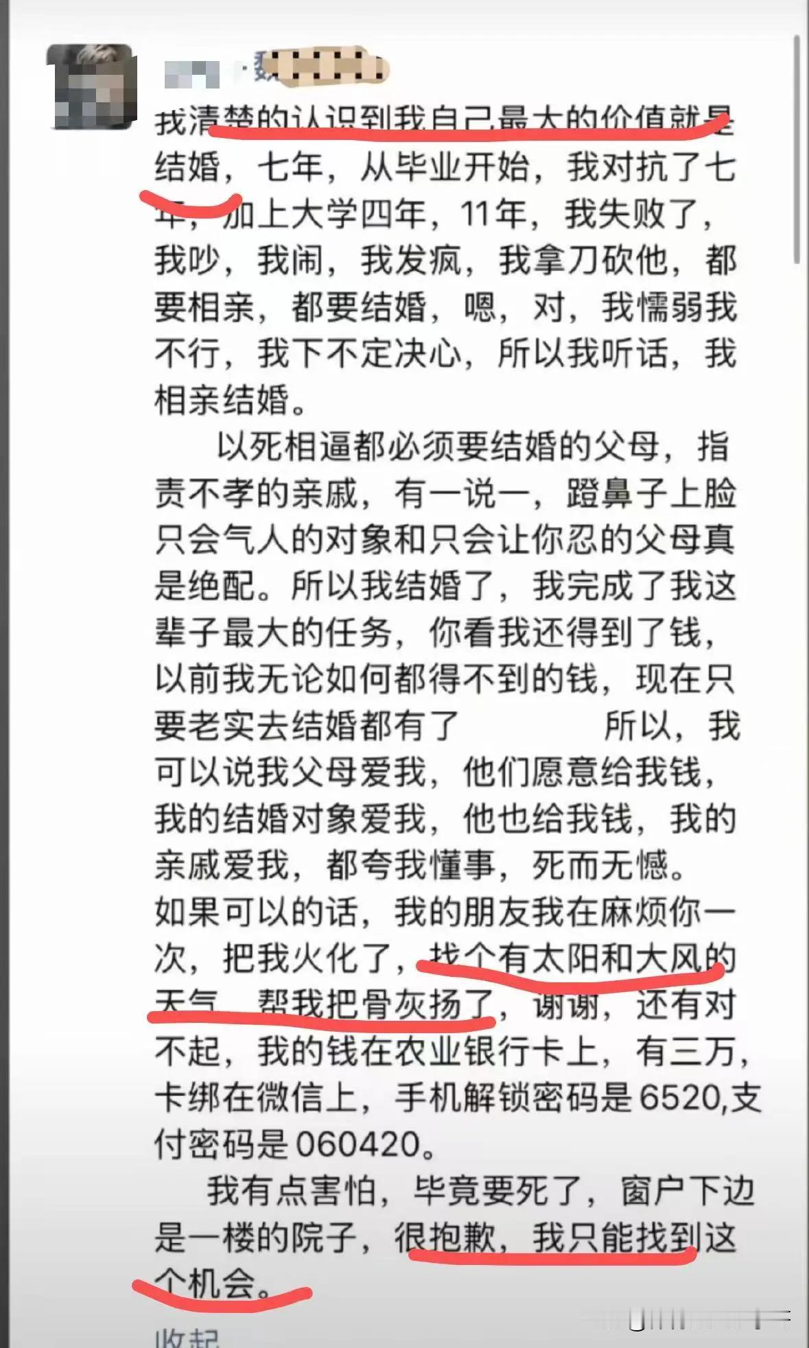 这位28岁的美女历史教师到底还是被父母或者说被整个相亲压力给逼死了! 因为我来自河南农村,又加上这位死者来自于平顶山鲁山县,离我们家就百十公里,所以说非常近,无论是风俗还是道德礼教,还是这种对于女生年龄相亲的紧迫性都是一致的,此时我深刻同情这位女老师,但是也为她感到惋惜和悲哀,因为她通过自己的努力,通过自己的笔试和面试,以综合成绩第一的成绩进入鲁山县某个公立高中,而且教的历史成绩也非常的优秀,她自己本身也是名牌大学毕业的,但是从高考前17岁开始,父母都开始催她结婚,一直等到大学毕业再参加,再加上她参加工作了五六年,父母都觉得大学毕业之后还不结婚,简直不像话,所以说就不停的催她,在父母的和亲朋好友的撮合之下,最终选择了和一个也许自己并不相爱的男生结婚,但是在结婚的当天却从7楼一跃而下,她发了最后一条朋友圈,说从17岁开始一直到28岁,整整抗争了11年,但是还是无济于事,父母仍然逼她结婚,因为不结婚的话,觉得人生不完美,不结婚的话,父母觉得任务没有完成,而丝毫不顾虑到她自己内心的想法,还有她的期待,可能她也无法对抗着整个社会舆论和压力,还有亲朋好友的期待,只能选择在结婚当天一跃而下,你想想7楼,三七二十一都20多米,所以说非死即伤,最终在警察和120到达的时候,人已经没有了呼吸。 当时所有参加婚礼的人一脸惊愕,都不可思议,这个新郎有点后悔没有看住新娘,但是如果她有必死的决心的话,新郎也无济于事,婚纱照已经拍了,两人结婚证也已经领了,但是却发生了这样的事情,而且她还对于1楼的商户表达了道歉,我觉得真的是一个巨大的悲剧: 第一是她不该选择这种极端的方式来结束自己的性命,这样的话,其实最痛心的可能是她的父母,虽然父母刀子嘴,但是豆腐心,无论怎么说也不应该结束自己的性命,身体发肤,受之父母; 第二的话是她本应该有大好的前景,完全可以选择自己喜欢的男生结婚,完全也可以选择作为同行业的老师结婚或者说远离自己的父母,不一定非要待在家乡,你待在家乡的话,就是会受到父母各种各样的职责或者是控制呃,完全可以去北上广深啊或者杭州啊,南京这些二线城市去发展,而没有必要待在家乡; 第三的话,处理的方式太过于极端了,完全可以通过沟通的方式与父母推心置腹,如果父母的认知就在那个水平,你完全可以逃离他们,就像我一样,我也会受到父母的催婚呐,但是没有必要和父母吵的狗血喷头的,他毕竟是自己的爹娘,可以通过更友好,更平和的方式去解决!