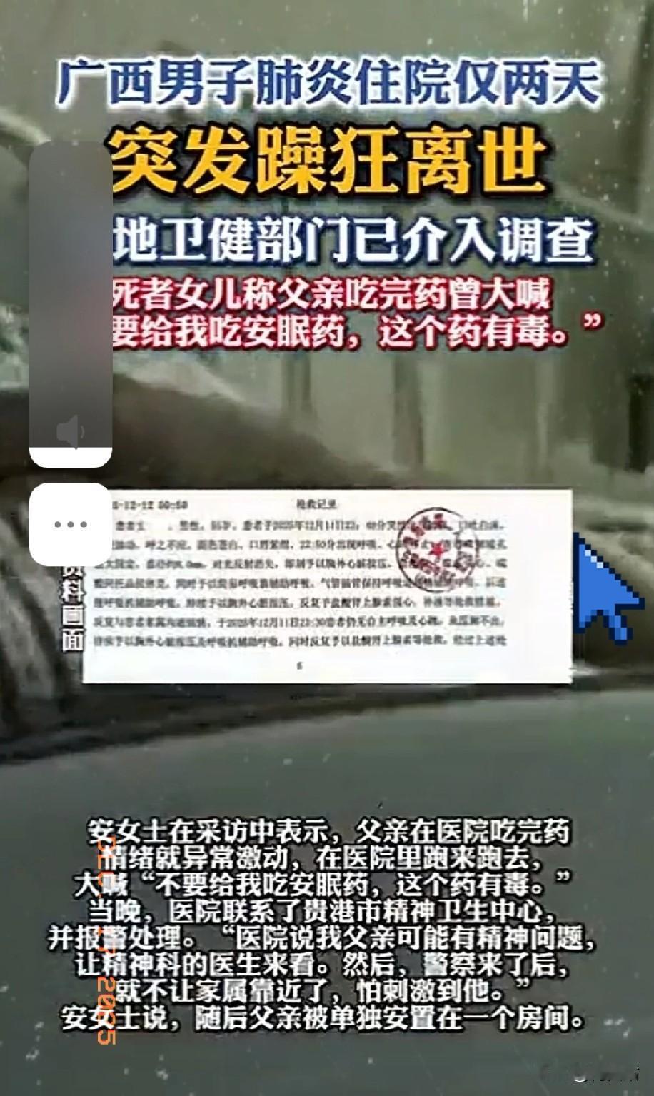 为什么一场“非重症肺炎”,会让55岁男子在住院48小时内突发躁狂、抢救无效离世? 12月10日,广西贵港的安富生因咳嗽半月入院,被诊断为“社区获得性肺炎(非重症)”,医生仅告知其“轻微发炎、钠钾缺失”。但11日傍晚6点半,他服药后突然情绪失控:在病房奔跑嘶吼“这个药有毒”,自行拔掉留置针,甚至与其他患者家属争执——院方给他服用了镇静药地西泮,症状却并未缓解,反而在22时被建议转院,23时20分突发呼吸心跳骤停,12日凌晨宣告临床死亡。 更让家属崩溃的是:整个用药过程中,医护人员未告知药物名称、副作用;患者躁狂后,医院以“疑似精神问题”报警隔离,家属被禁止靠近,直到抢救时才被允许进入。安女士的核心疑问至今悬而未决:父亲无精神病史,为何突然失常?镇静药的使用是否合规?隔离后的监护和抢救是否及时? 目前,当地卫健部门已介入调查,尸检于15日完成但结果未出。这场从“普通咳嗽”到“猝然离世”的悲剧,戳中了公众对医疗知情、应急处置的担忧——当常见病遇上突发异常,诊疗的每一个细节,都可能是生命的“生死线”。