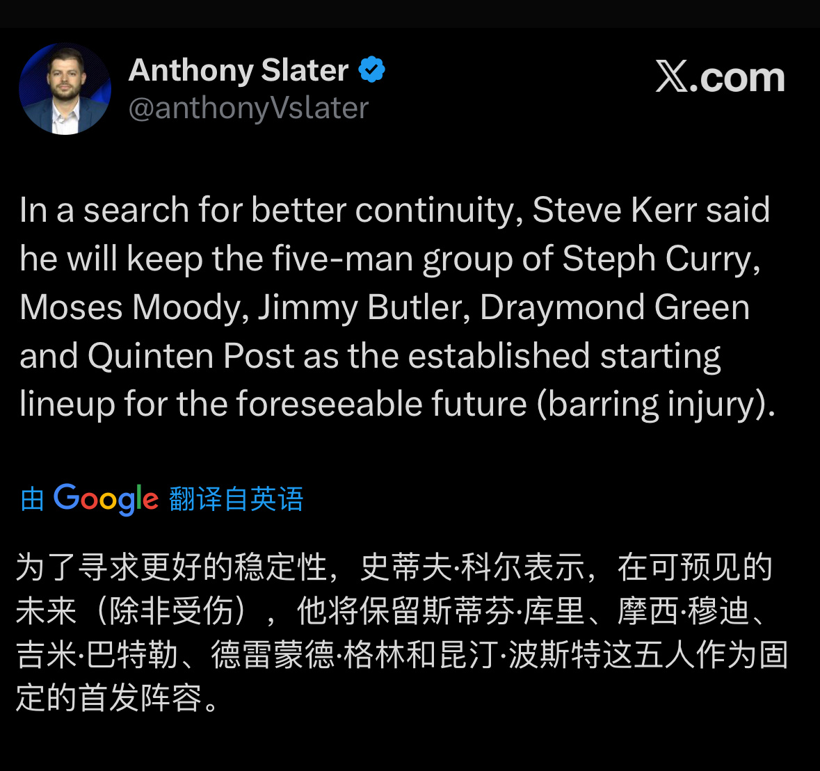 为了寻求更好的稳定性,科尔表示,在可预见的未来(除非受伤),他将保留库里、穆迪、巴特勒、追梦和波斯特这五人作为固定的首发阵容新赛季篮不住