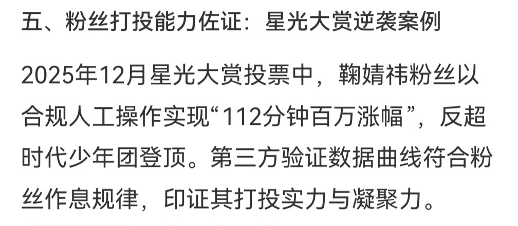 鞠婧祎工作室 粉丝打投 微博智搜结果:2025年12月星光大赏投票中,鞠婧祎粉丝以合规人工操作实现"112分钟百万涨幅",反超时代少年团登顶。第三方验证数据曲线符合粉丝作息规律,印证其打投实力与凝聚力🙊🙊鞠婧祎粉丝这么牛的吗