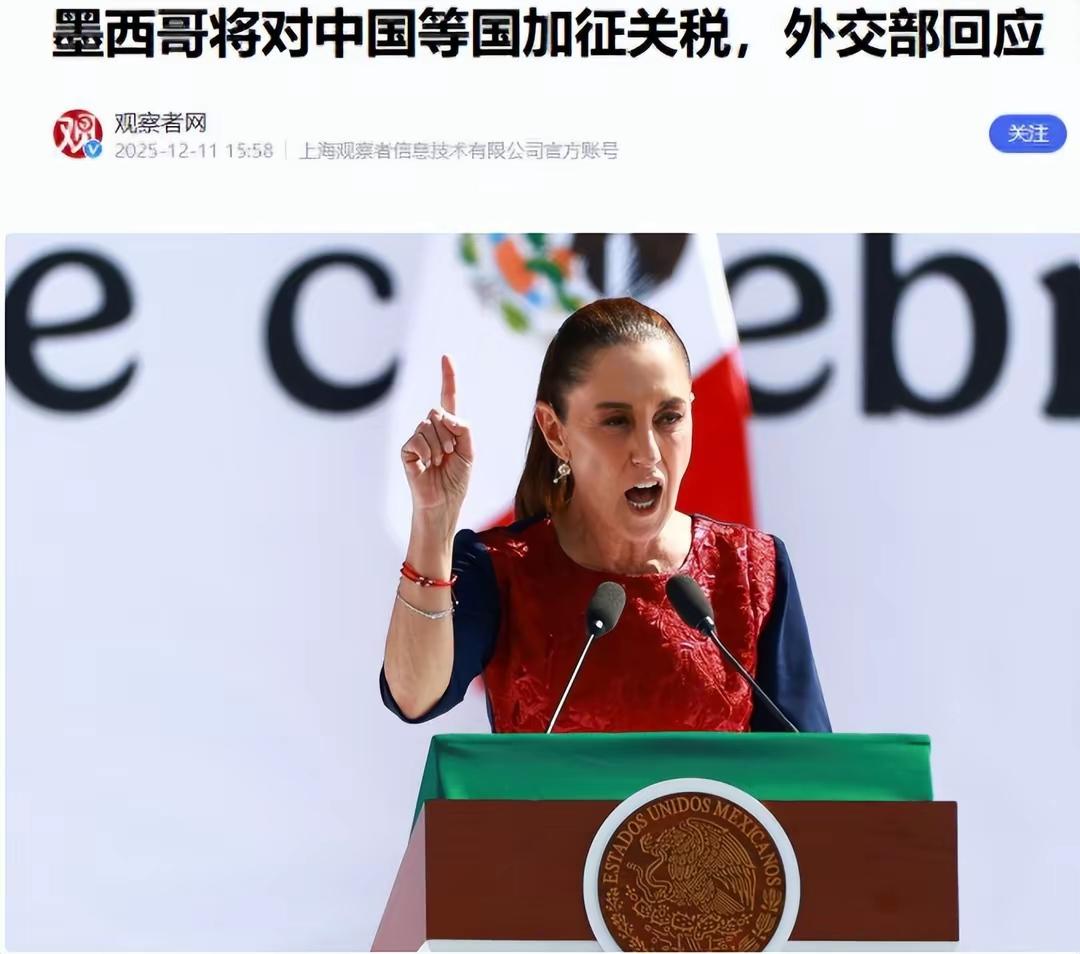 对站队美国的墨西哥,必须施以重拳打击,否则的话会有更多国家跟进 墨西哥定于2026年1月1日实施的对华50%高额关税,是迎合美国霸权的单边贸易保护行径,严重损害中墨经贸互信与全球供应链稳定。若纵容这种“以邻为壑”的做法,必将引发连锁跟风效应,破坏国际贸易规则根基。对此,中国必须采取精准有力的反制措施,捍卫自身合法权益。 首要反制举措是强化战略资源出口管控。中国掌控全球90%以上的稀土精炼产能和超七成电池材料产能,而墨西哥汽车产业近40%核心零部件依赖中国供应,其电动车驱动电机所需的钕铁硼永磁体更是高度依赖中国出口。中方将全面禁止稀土及相关磁体、动力电池的对墨出口,同时暂停电池材料技术合作,直接切断墨西哥汽车产业的供应链命脉,使其400万辆年产能陷入“无米之炊”的困境。 其次,对等反制墨西哥优势出口产品。针对墨西哥对华出口占比极高的原油(22%)、医疗仪器(18%)等产品,中方将启动反倾销、反补贴调查,依法加征等额报复性关税。2024年中墨贸易额达1094亿美元,墨西哥对华出口依赖度远高于中国对墨进口,此举将让其每年损失数十亿美元出口收益,远超加税带来的短期财政收入。 第三,收紧对墨投资与供应链监管。中方将加强墨西哥在华汽车品牌、农产品供应商的合规审查,限制其市场准入与资金流动;同时引导在墨中资企业调整供应链布局,暂停新增投资与技术输出,终止“中国产零件-墨西哥组装”的合作模式,让墨西哥制造业面临成本飙升与技术断层的双重冲击。 此外,中方将在WTO框架下起诉墨西哥单边关税措施,联合其他受贸易保护主义影响的国家,形成反制合力。同时深化与巴西、智利等拉美国家的经贸合作,替代墨西哥在中拉贸易中的角色,让其彻底错失中国市场增长红利。 中国的反制并非寻求贸易对抗,而是对单边霸凌的必要回应。墨西哥若执意在中美之间选边站队,终将为迎合美国付出沉重代价。这一系列措施也向世界传递明确信号:任何国家胆敢挑战中国核心利益、破坏贸易公平,都将面临精准反制。唯有回到平等协商轨道,才能维护中墨经贸关系的可持续发展,这也是对全球贸易秩序的共同责任。
