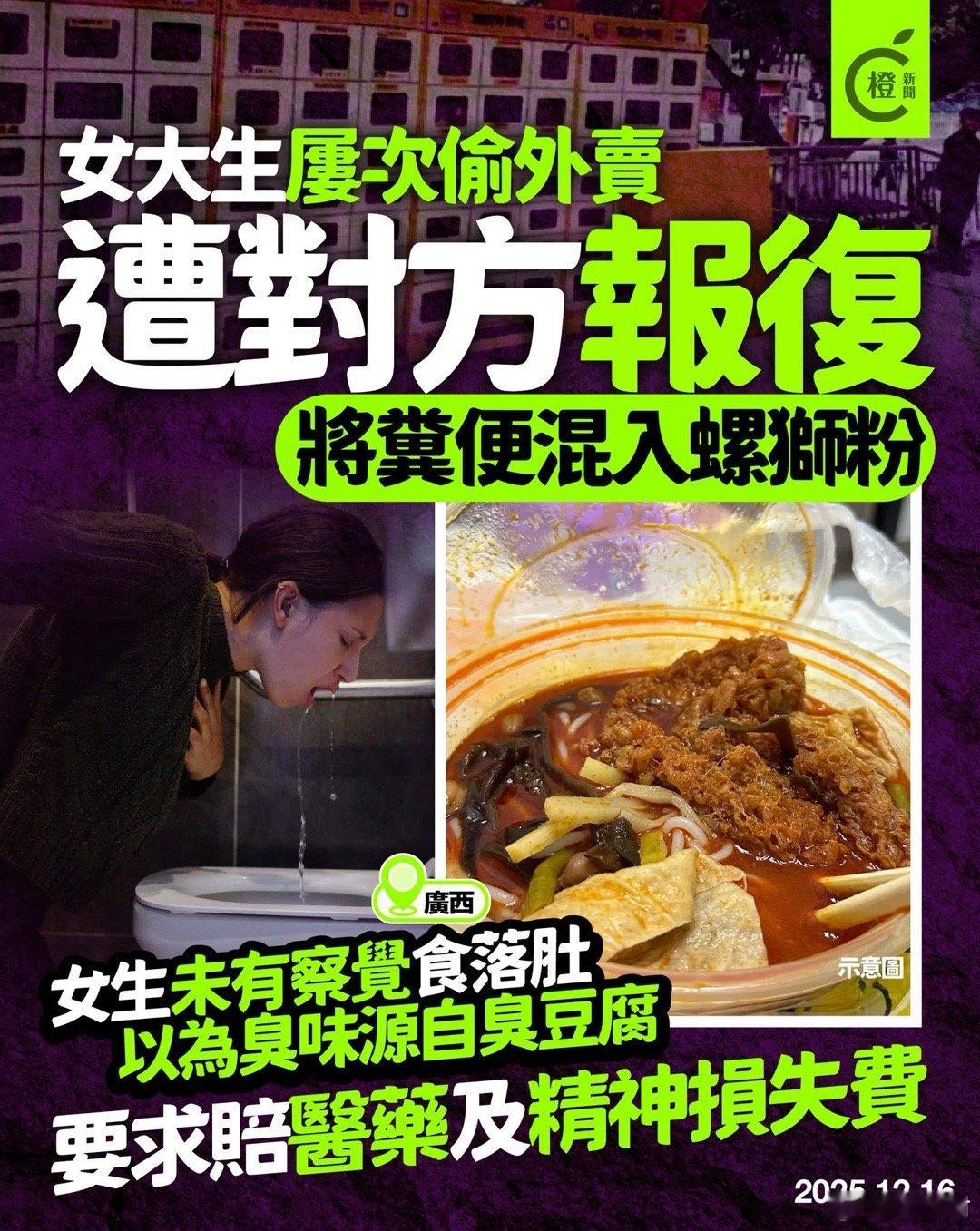 女大生屡次偷外卖遭对方报复 惨食「屎味」螺狮粉迷惑行为大赏 广西某大学一名女学生发文控诉,称自己吃到被人「刻意加入排泄物」的螺蛳粉,导致身心受创,还扬言向对方索取医药费及精神赔偿。她称平日曾在校园外送柜「顺手拿走」别人的外卖,但只是「一两次拿错」,又质问对方「良心去哪了」,认为即使自己有不对,对方往食物中加入粪便再以臭豆腐掩盖气味,也太过分。很快,有自称是「失主」的男同学写下长文及纸条回应,指自己的奶茶、水果、外卖多次在外送柜离奇消失,认为有人惯犯「偷走」,一气之下决定报复。 他表示特意点味道浓烈的螺蛳粉,事先请店家不要封死外送包装,再自行将排泄物与拖地脏水加入餐盒内,用保鲜膜紧封,打算报复小偷。该份外卖放进外送柜不到一小时便被取走,并指让偷外卖的人吃下这份「定制」餐点,感到「相当痛快」。事件迅速在校园群组疯传,女学生不但没有收敛,反而情绪失控,在外送柜前多次以脚狂踹,致部分柜门变形损坏,一名外送员上前劝阻亦遭她恶言顶撞。大批网民痛批「做坏事还敢装受害者」、「不知廉耻到这种地步才真正可怕」等留言。