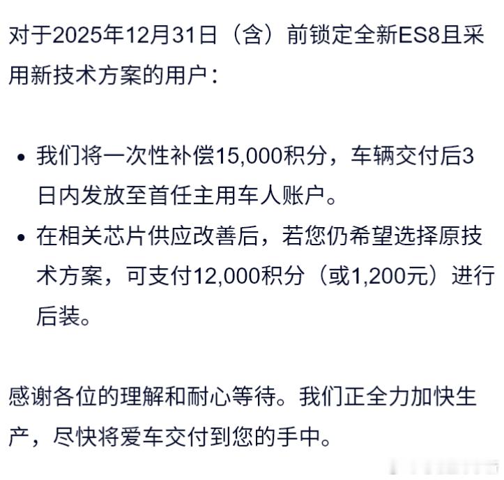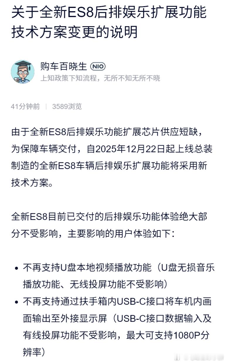 蔚来全新 ES8 后排娱乐扩展功能将采用新技术方案- 不再支持 U 盘本地视频播放功能- 不再支持通过扶手箱内 USB-C 接口将车机内画面输出至外接显示屏对于采用新技术方案的用户将一次性补偿 1.5 万积分,还是想选择原技术方案的用户可以支付 1.2 万积分进行后装,这两个功能感觉平时也用不太上,大家怎么选?蔚来全新ES8蔚来