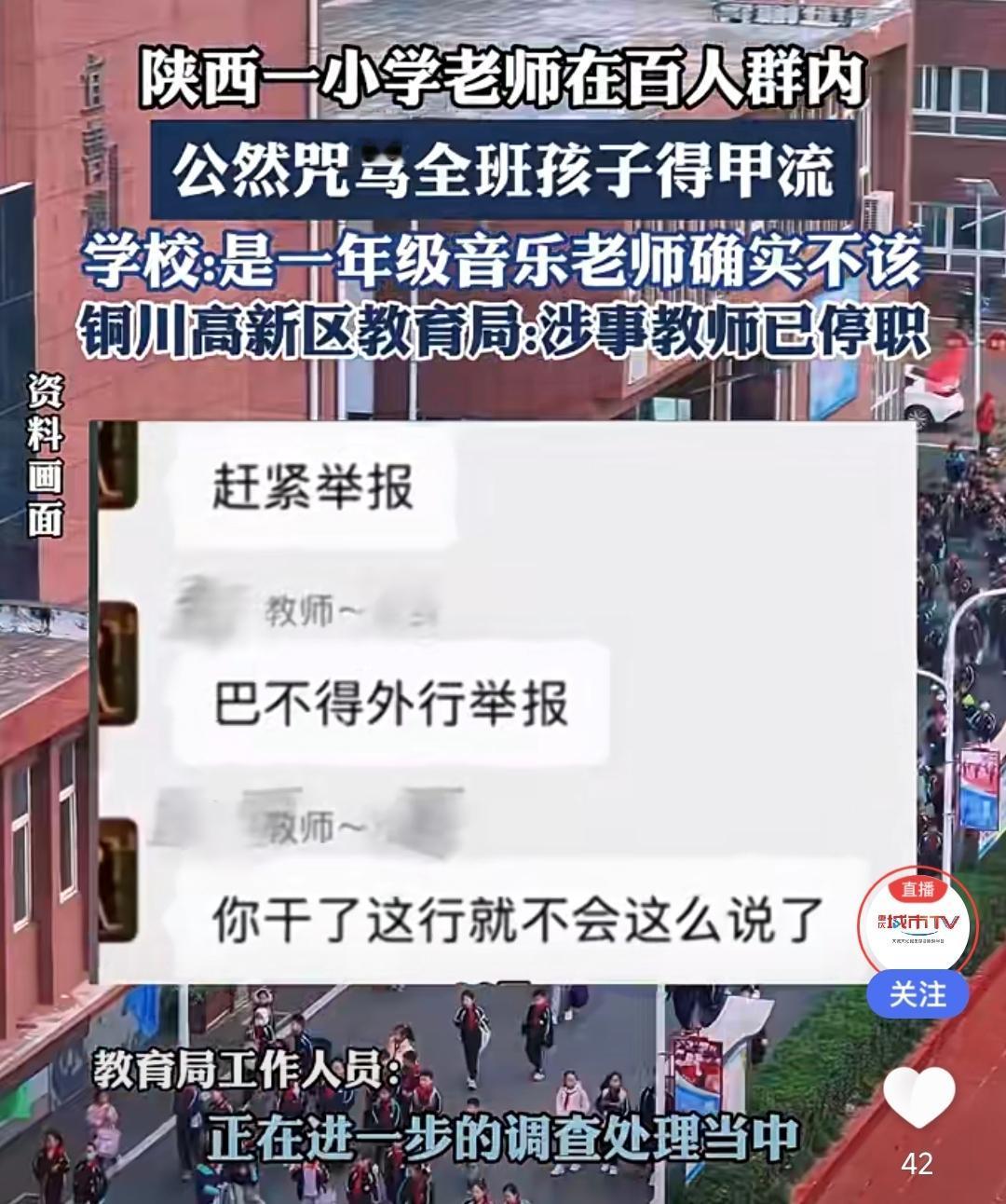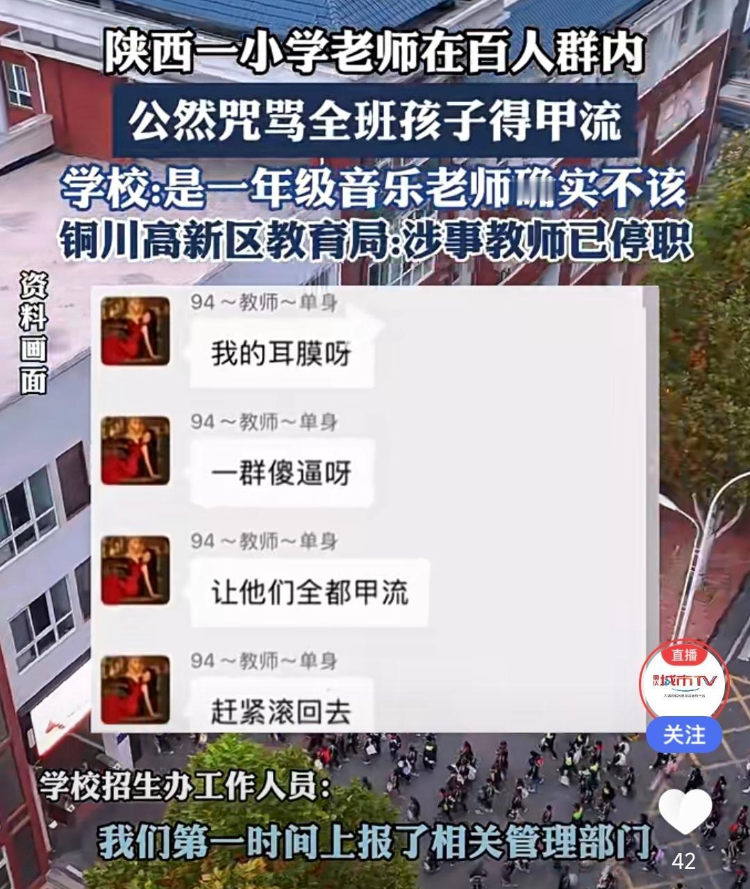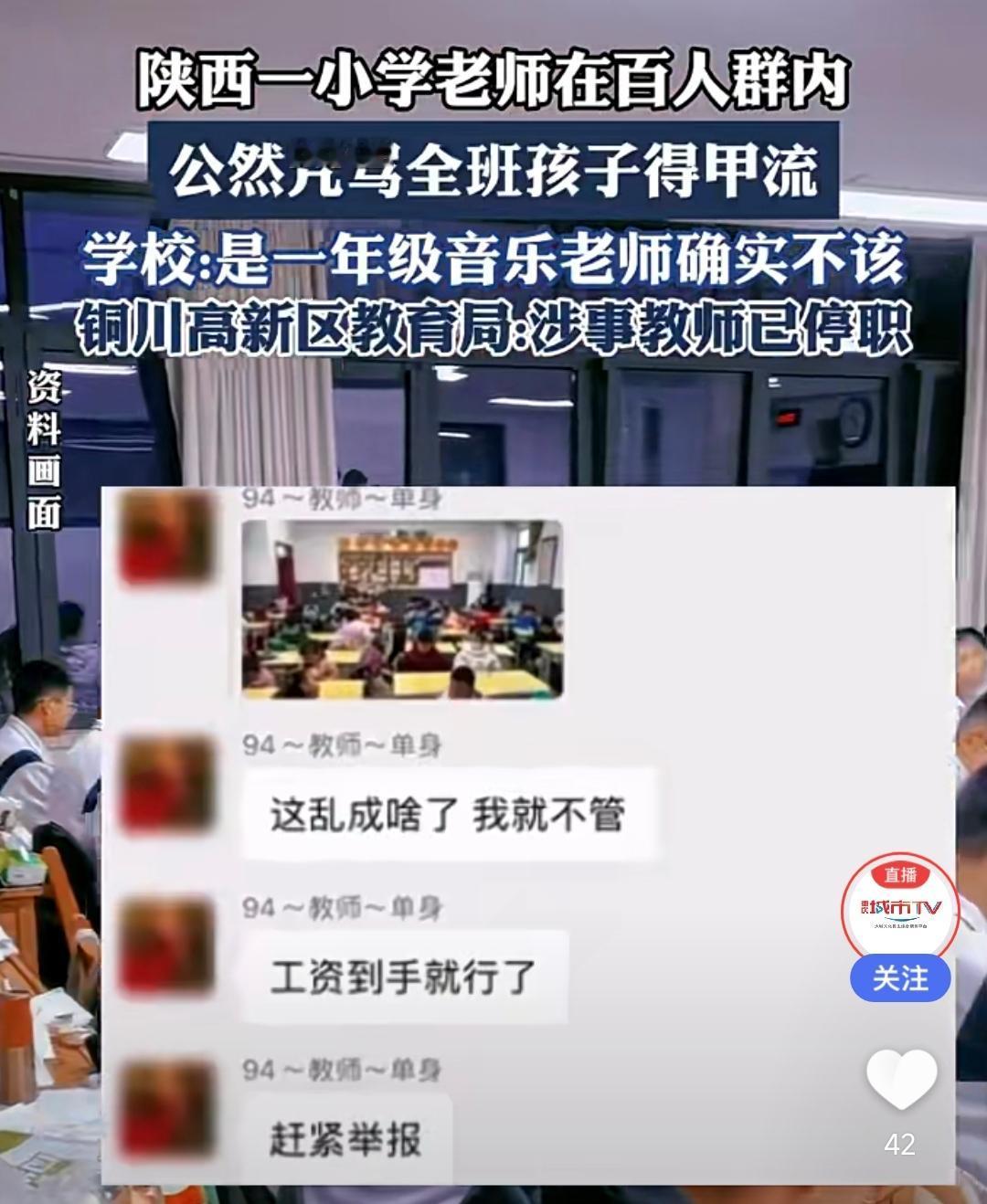 一句诅咒让家长心头滴血,一份编制成了她肆无忌惮的护身符,这位教师再次刷新了师德底线,也揭开了教育系统中最刺痛人心的疮疤。 “让他们全都得甲流,赶紧滚回去!”当这句恶毒诅咒从一个小学音乐老师的聊天记录中流出时,全网家长都怒炸了! 老师的职责本该是教书育人,可陕西铜川高新实验学校的音乐教师李某某,却在百人群里毫不掩饰的对一年级学生表达厌恶,用最恶毒的语言诅咒年幼的孩子全部生病。 从聊天记录中流出,这位李老师抱怨上课学生很吵,竟直接破口大骂:“我的耳膜呀,一群XX,让全班全都得甲流!” 群友的劝阻和质疑没能阻止她,反而更点燃了她的戾气。她毫无愧色地回怼:“这乱成啥了,我就不管,工资到手就行了,你们赶紧举报。” 当被问及你这种心态是否适合从事教育工作时,她亮出了自以为的“免死金牌”:“不好意思,我有编制。” 这句话背后透出的冷漠让人脊背发凉——“那些学生又不是我的孩子,与我无关”。这种教师简直让人无法接受。 可耻啊,作为一名教师,非但没有尽到保护学生的责任,反而还恶语相向,诅咒幼童染病,这算哪门子老师? 事件曝光后,网友和家长愤怒“把孩子交给这样的老师,谁能放心?” 可为什么现在有的教师会如此冷漠?为什么“有编制”成了她肆无忌惮的底气? 可笑的是,在这位教师口中,编织却成了可以漠视职责、侮辱学生的“护身符”。 目前,当地教育局通报涉事教师已停职,多部门介入调查。学校也表示“会给大家一个交代”。 然而,公众的质疑并未因此平息。人们关心的是停职之后呢?会不会过段时间换个学校继续任教?教师资格证会不会被吊销?编制身份会不会成为她逃脱严厉处罚的保护伞? 很明显,这位教师的言论反映出的不是单纯的情绪失控,而是职业认同的缺失。她把教育这份工作看作是换取工资的交易,把学生看作影响她舒适度的麻烦。 教育的基础是爱与责任,编制不应成为冷漠的护身符。只有当“师德红线”真正带电,对失德行为的惩罚足够严厉,才能守住教育最基本的底线。 教书育人,首重师德。学高为师,身正为范。 连基本的仁爱之心都没有,就算有再多学识,再稳固的“铁饭碗”,也配不上老师二字。 这事,咱们必须较真!