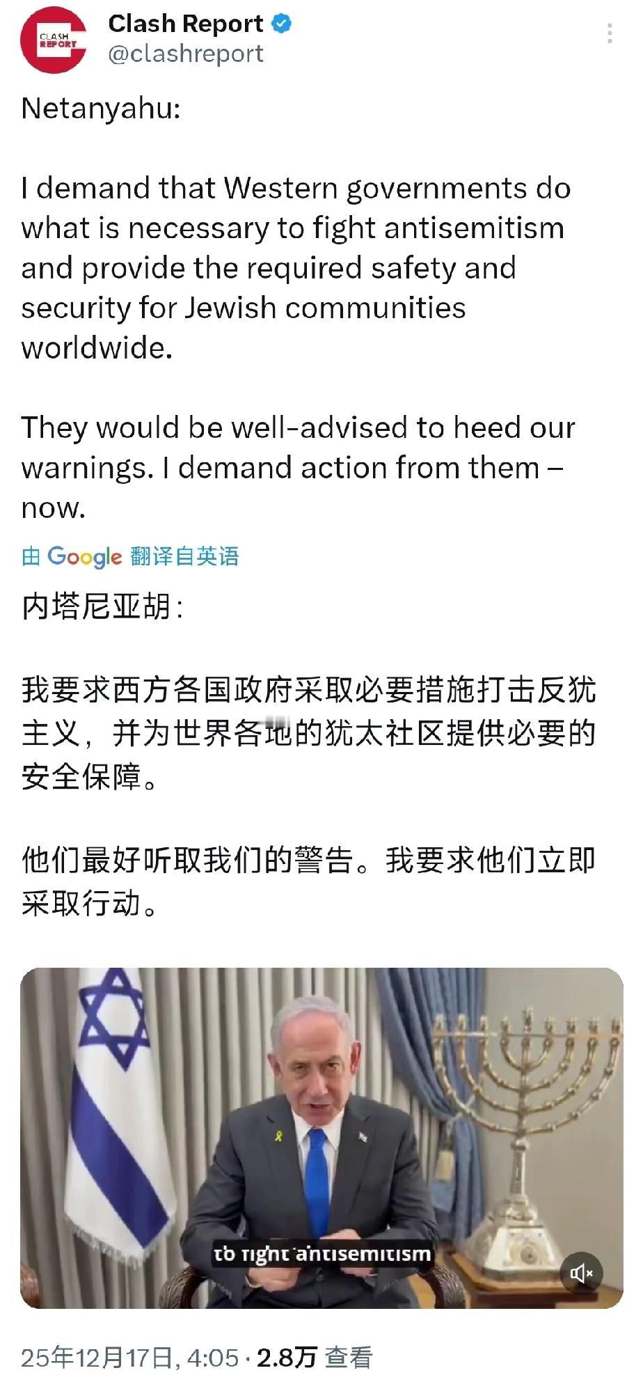 内塔尼亚胡:“我要求西方各国政府采取必要措施打击反犹主义,并为世界各地的犹太社区提供必要的安全保障。他们最好听取我们的警告。我要求他们立即采取行动。” 西方各国政府,你们得听话啊,要不内胡生气了,后果会很严重哦!不看他面子也得看看他身后那个谁!