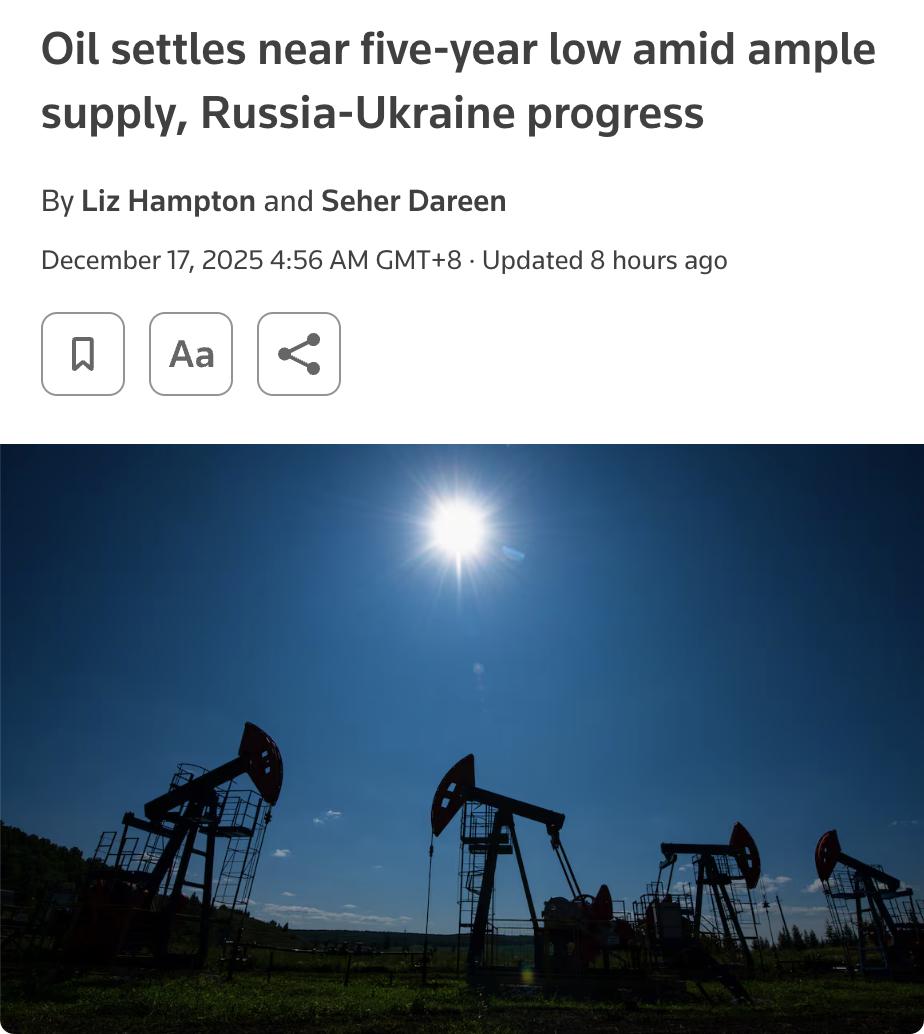 外媒:油价因供应充足和俄乌谈判进展跌至五年新低。 12月16日,布伦特原油期货结算价下跌2.71%至每桶58.92美元,美国西德克萨斯中质原油期货下跌2.73%至每桶55.27美元,均为2021年2月以来最低水平。 俄乌和平谈判取得进展,市场预期制裁可能放宽,导致俄罗斯原油供应可能增加,进一步加剧供应过剩。 此外,中国经济数据也增加了市场对全球原油需求不足的担忧。