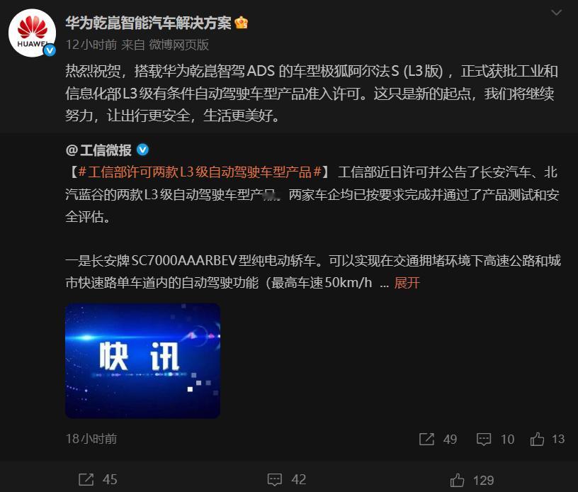 工信部正式公告两款L3级自动驾驶车型,注意是L3自动驾驶,这两台车不需要再说智驾和辅助驾驶了。从型号来看一台是长安深蓝SL03,一台是极狐阿尔法S,网传详细信息如图,华为乾崑官方也承认阿尔法S就是采用的自家方案,只能说毫不意外,这条路华子是真的领先,甚至还不是ADS 4,是初版ADS硬件+3.3软件。