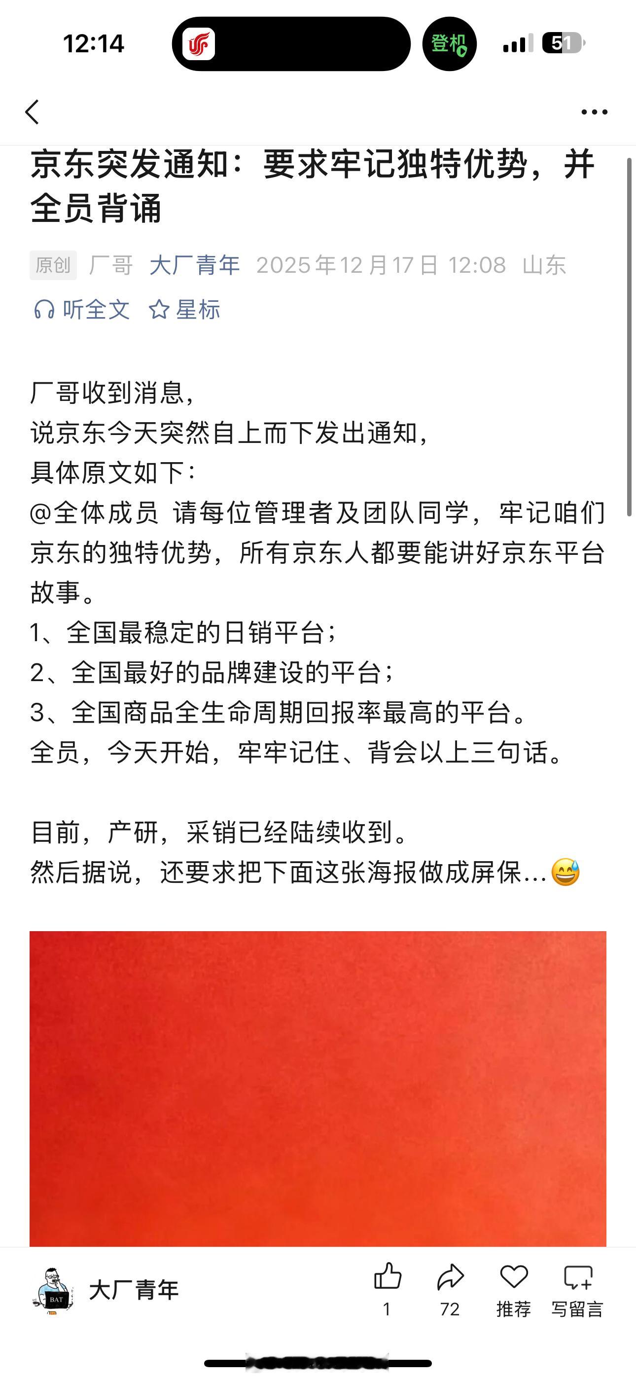 据大厂青年消息:说京东今天突然自上而下发出通知,具体原文如下:请每位管理者及团队同学,牢记咱们京东的独特优势,所有京东人都要能讲好京东平台故事。1、全国最稳定的日销平台;2、全国最好的品牌建设的平台;3、全国商品全生命周期回报率最高的平台。全员,今天开始,牢牢记住、背会以上三句话。目前,产研,采销已经陆续收到。然后据说,还要求把下面这张海报做成屏保…😅京东