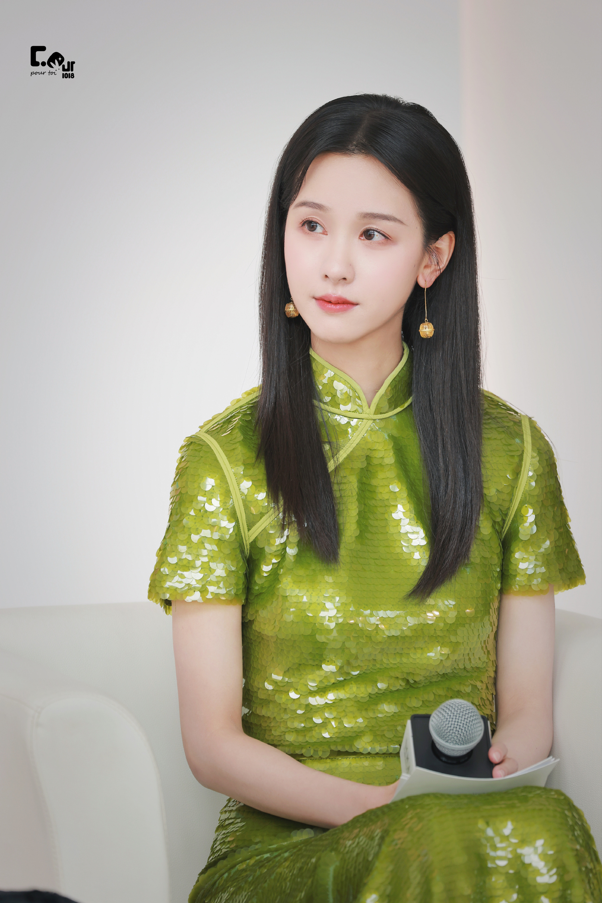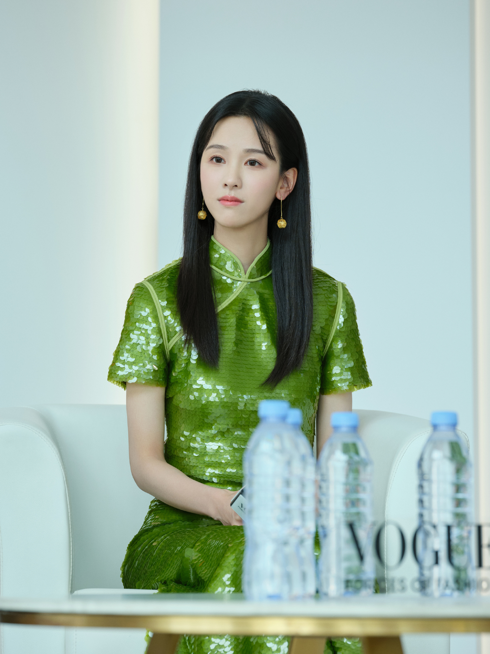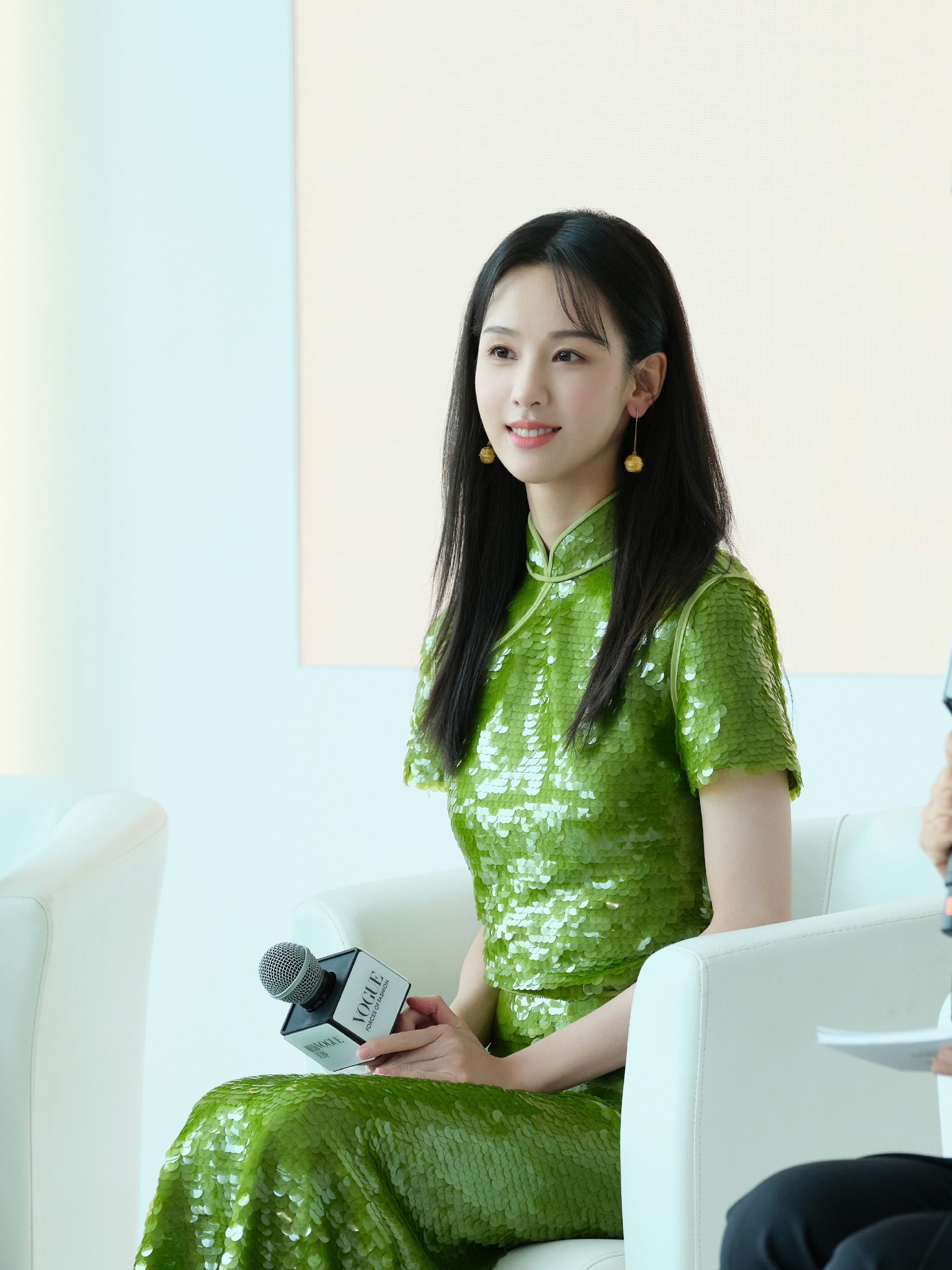 陈都灵绿色国风旗袍,嘟嘟这一身穿搭超美。陈都灵