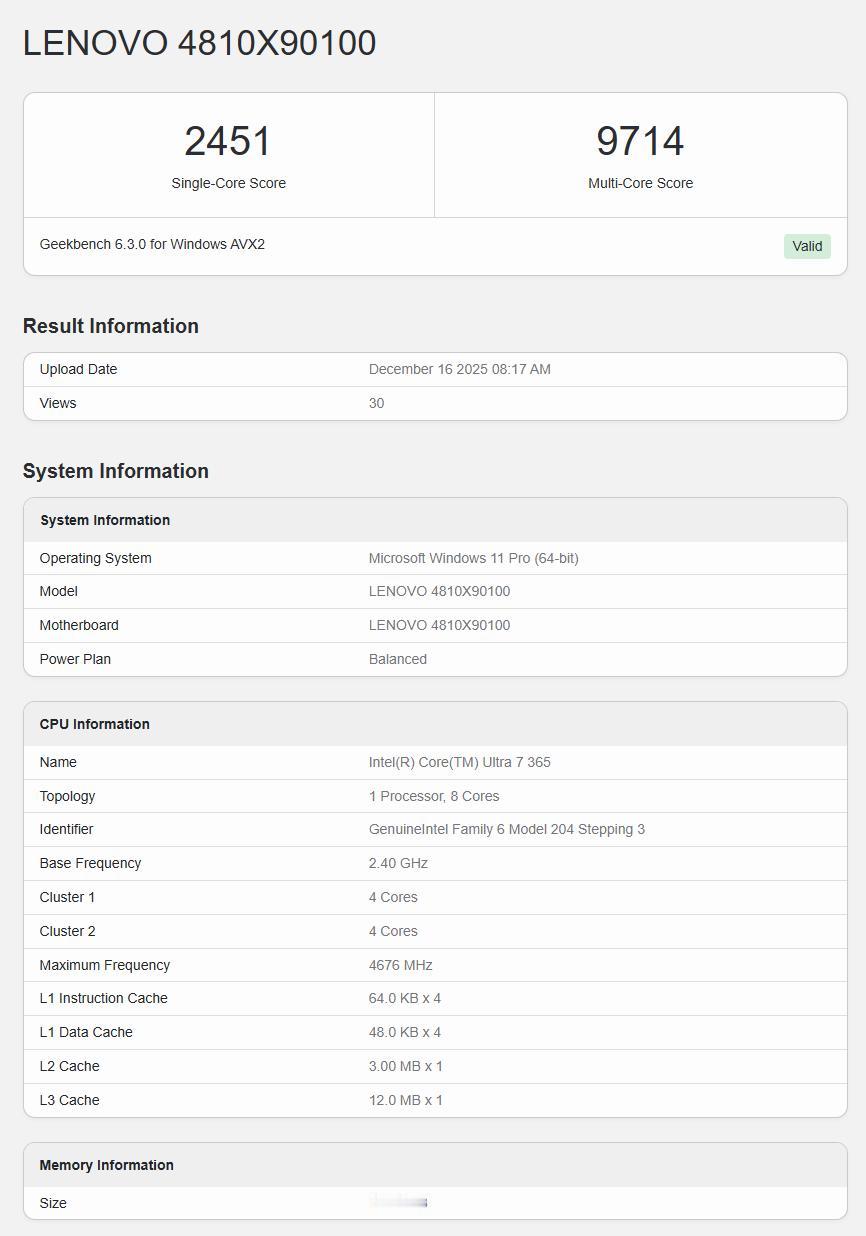 【英特尔最新酷睿Ultra 7 365曝光】近日,英特尔酷睿Ultra 7 365的初步跑分数据现身Geekbench,其性能表现竟然落后于前代的酷睿Ultra 7 268V。根据Geekbench 6.3的测试记录,酷睿Ultra 7 365在单核测试中得分为2451,多核得分为9714;作为对比,其前代产品酷睿Ultra 7 268V的平均成绩分别为2639和10318。换算下来,这款“新一代”的芯片在单核与多核性能上分别出现了约6%和7%的倒退,即便两者同样采用了4个P核+ 4个LP-E核的架构,但实测结果却不尽如人意。Ultra 7 268V的最高睿频可达5.0GHz,而目前的Ultra 7 365仅有4.7GHz左右。需要注意的是,目前曝光的应该是早期工程样品,硬件驱动与系统优化尚未到位,且跑分数据也比较少。