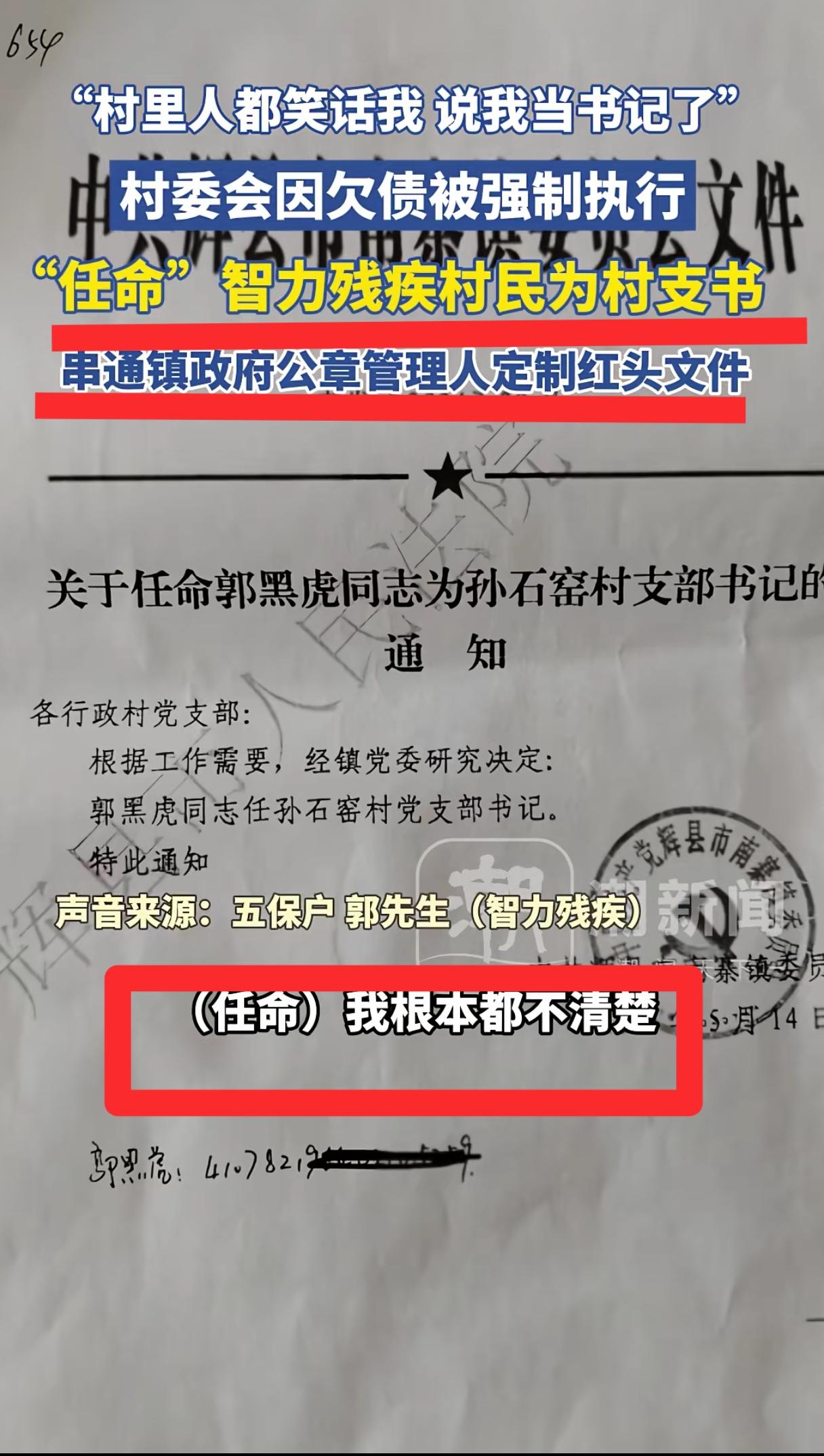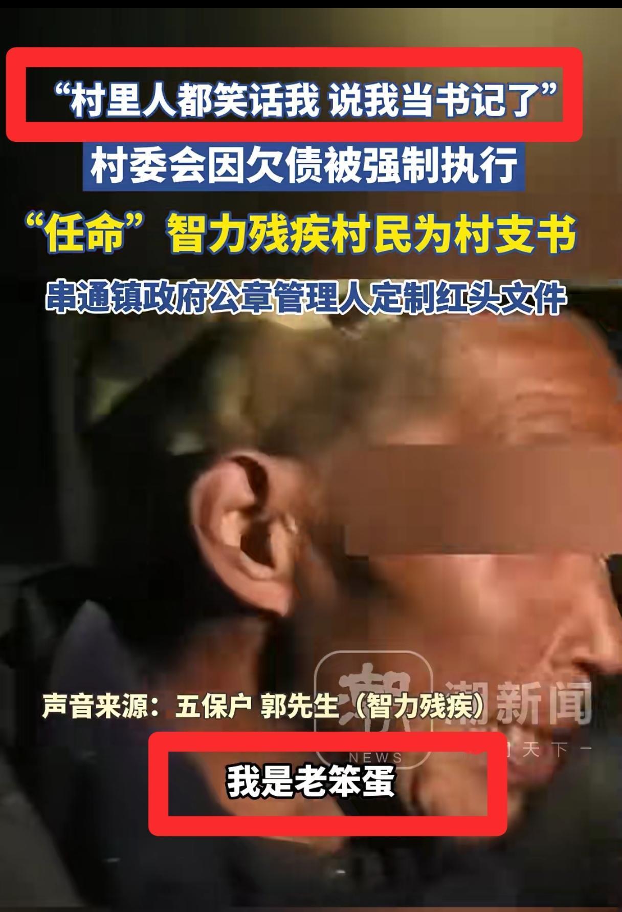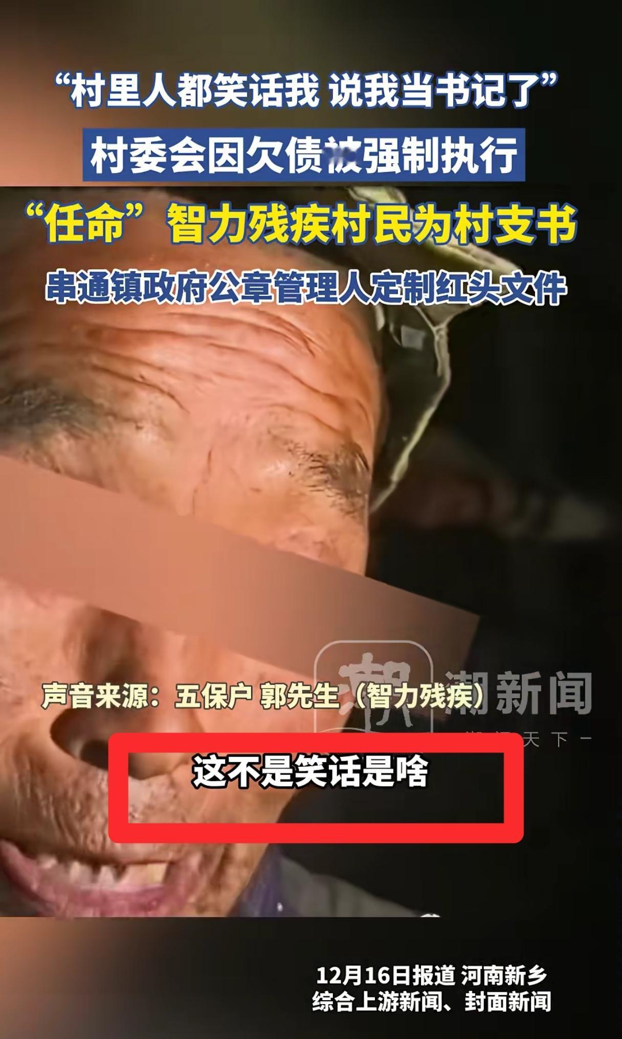 建议春晚节目单把这个真实事件加进去吧! 村里任命智力残疾的村民当村支书,这个书记应该是全国唯一一个五保户当官的吧! 小品名字都想好了,就叫《真假村支书》! 这个事情真的太玄幻了。河南新乡一前任村支书任职期间,因为村里财政困难,他长期垫付了数十万供村里使用,后来因为违纪被免职了。 随后他就向村里讨要欠款,法院最后判了,让村委会返还78万元。结果没等钱讨要回来,被执行的村支书帖某居然在两个月前换成了智力残疾的五保户村民。 面对记者的采访,村民也很无奈,苦笑称:村里人都笑话他,说他老笨蛋竟然当了书记。 大家说,这是三十六计哪一计?