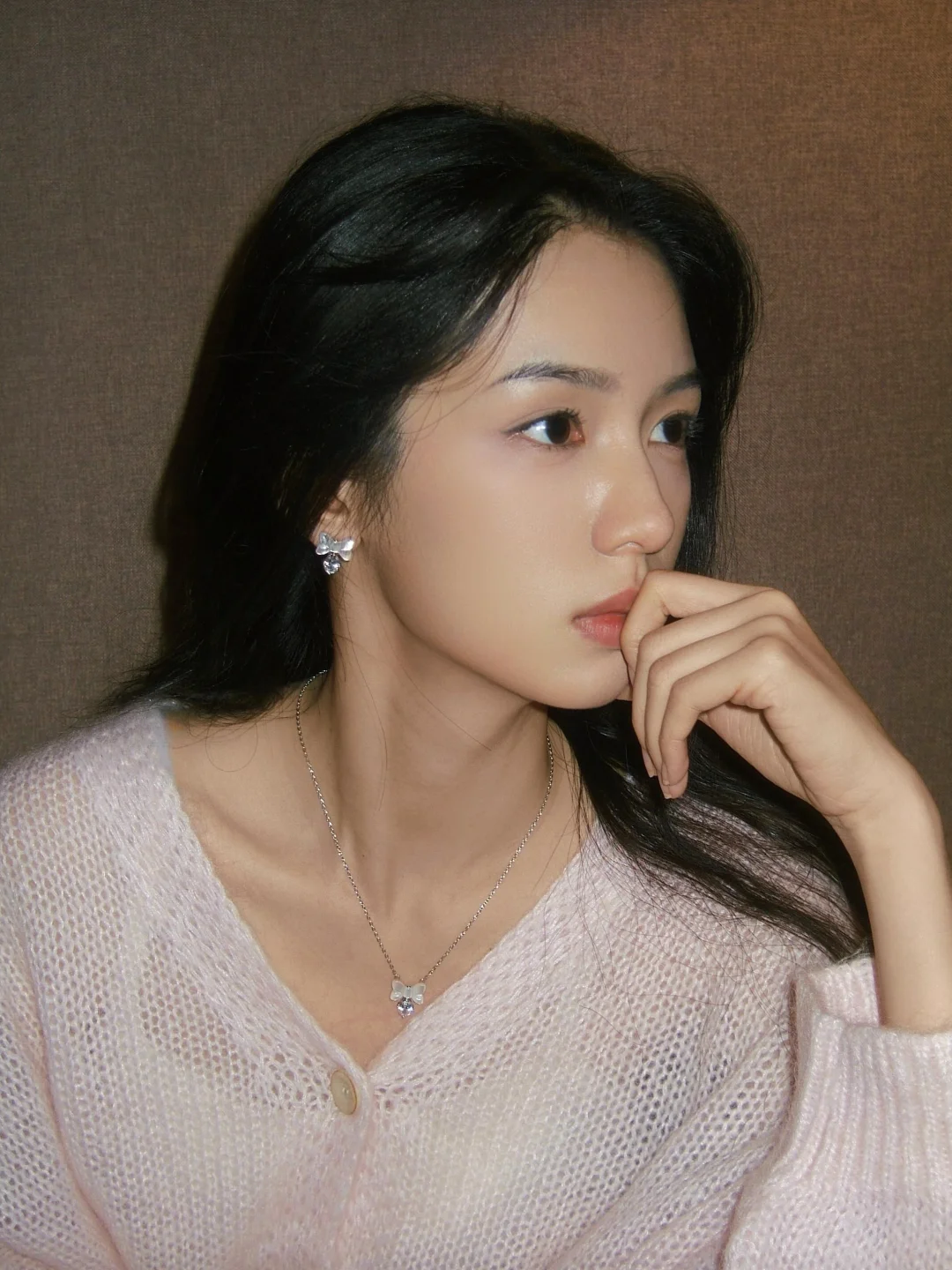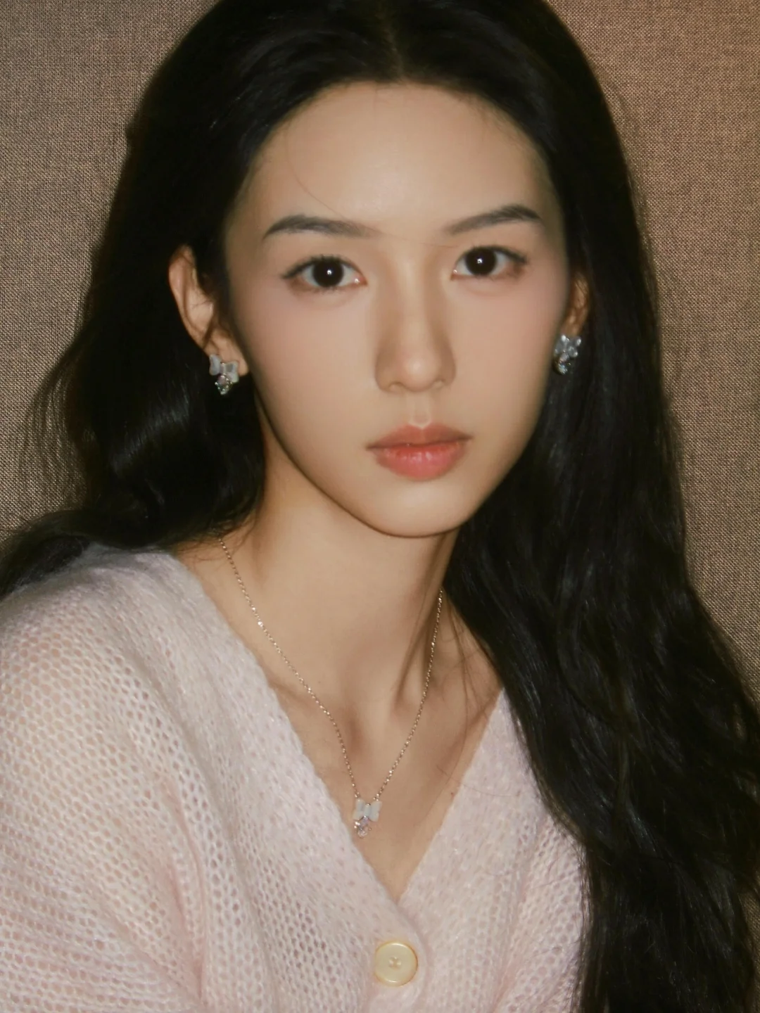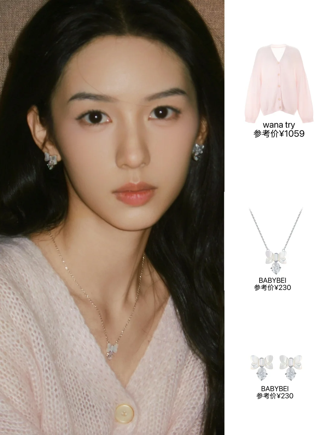 周也怼脸拍,脸小而精致,还是发量王者,这优越条件不是美女都难,穿搭也很温柔,粉色针织衫配蝴蝶首饰点缀,温柔优雅! 周也 明星同款 明星不止AB面 图源 网络
