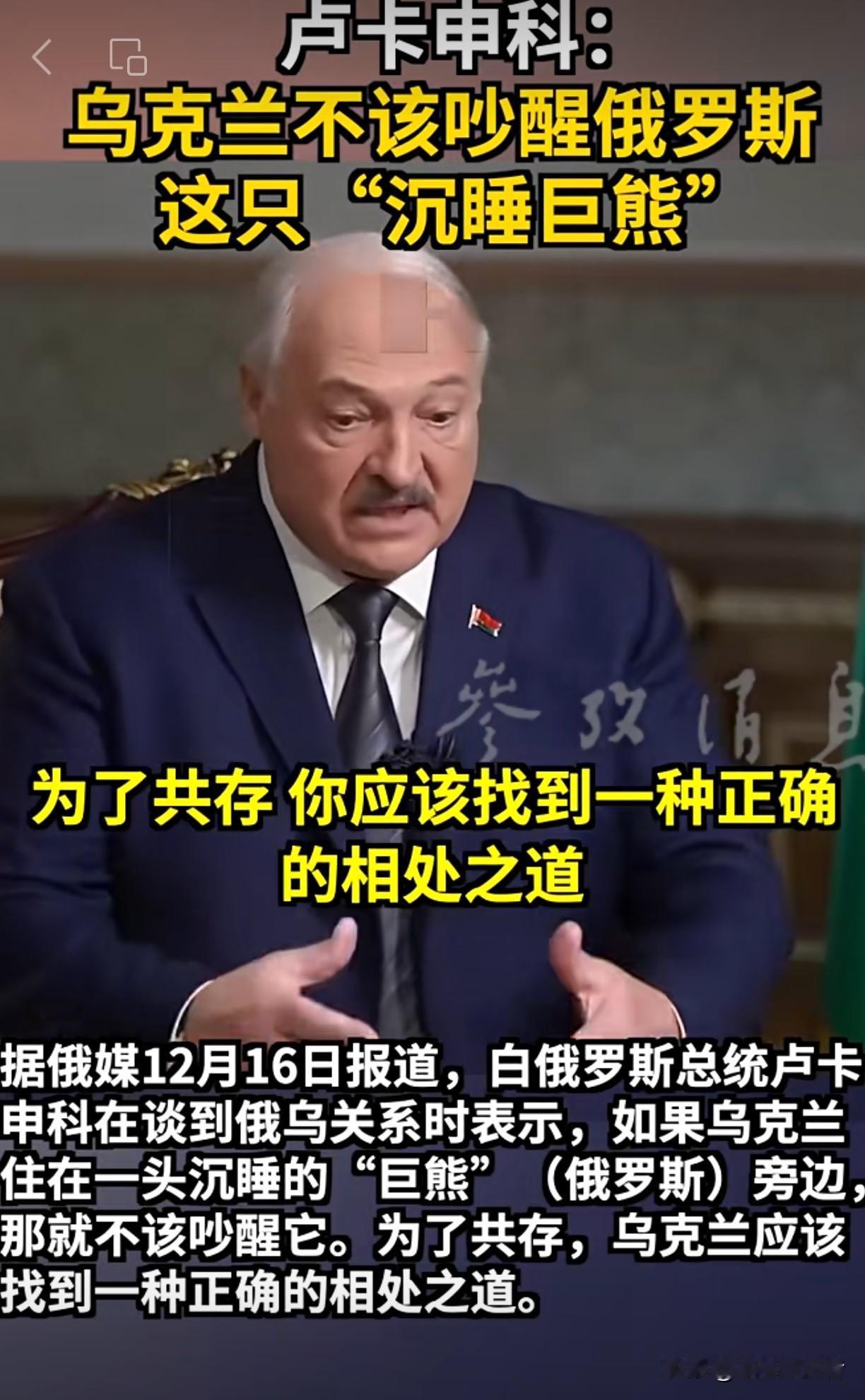 白俄罗斯总统卢卡申科说:“乌克兰不应该吵醒俄罗斯这只‘沉睡巨熊’,为了共存,乌克