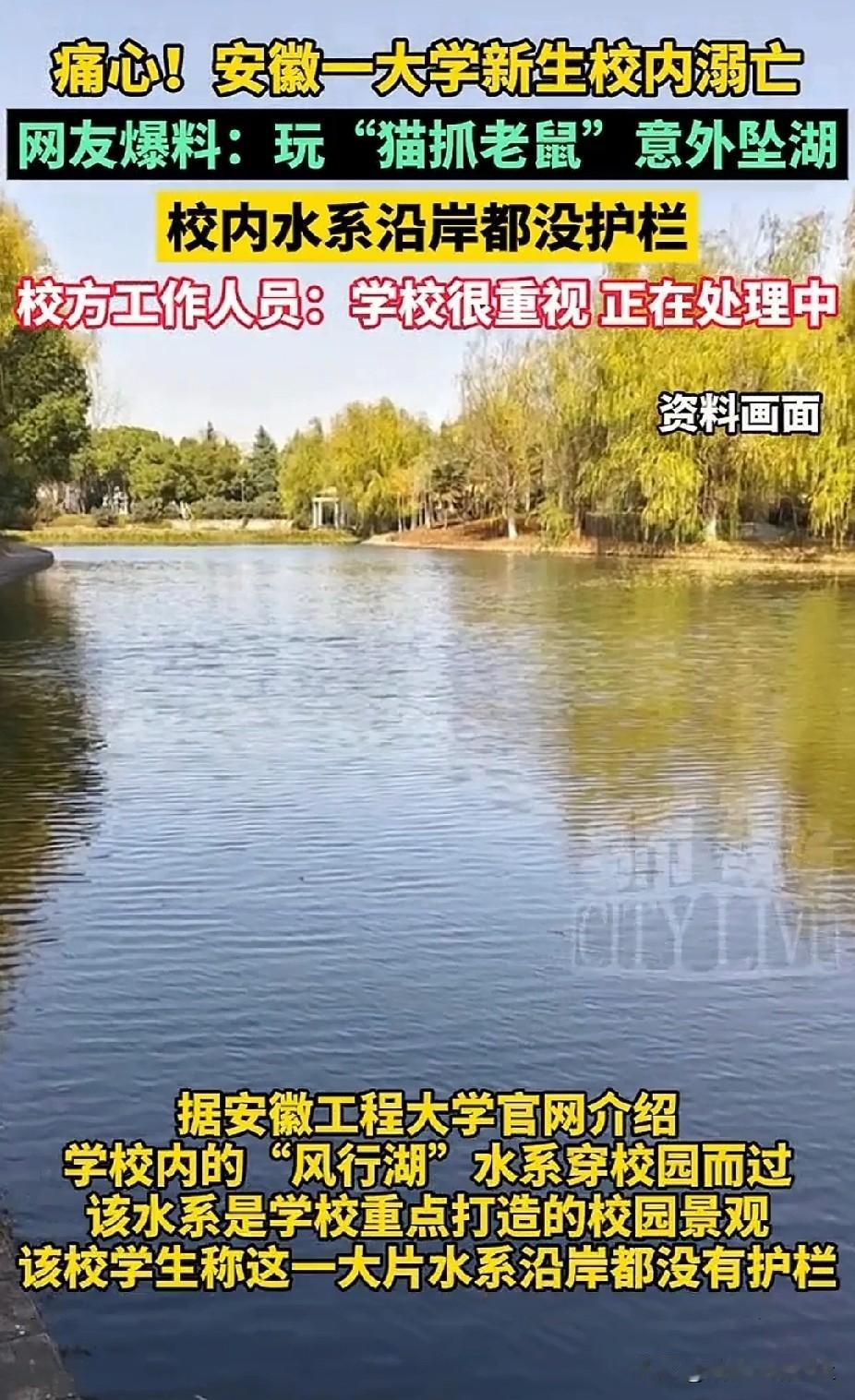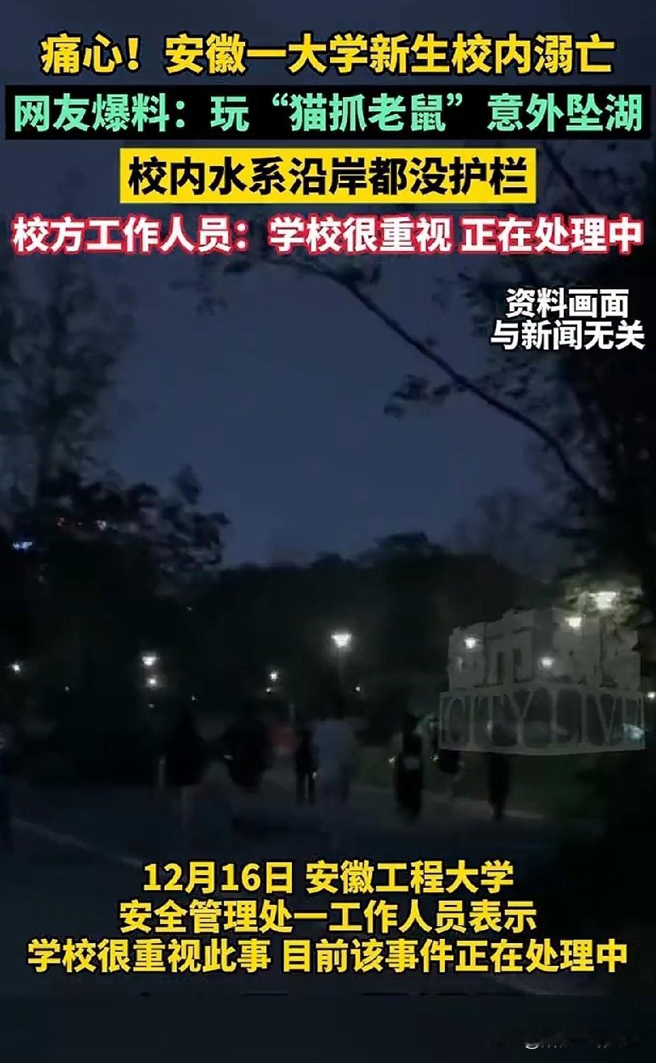 “悲剧重演”!安徽大一女生,入学仅3个月,在校内玩捉迷藏溺水身亡,父母接受不了打击。 近日,安徽某大学大一女生不幸溺亡的消息,牵动着无数网友的心。 据悉,这名溺亡的女生叫小菲,是一名2025级新生,来自于一个普通的农村家庭。 有知情者透露,悲剧发生在12月8日的夜晚。 学校有一个重点打造的景观水系,风行湖贯穿整个校园,湖岸沿线却并未设置防护栏。 部分区域到了夜间,更是光线昏暗,不是一个晚上敢去散步的地方。 而这名计算机专业的女孩,在参与“猫抓老鼠”的游戏时,不慎失足跌入校园内的湖内溺亡。 游戏散场后,同学们以为女生早已回前宿舍,便陆续返回宿舍。 直到当晚11时左右,同寝室的室友才察觉女孩迟迟未归。 焦急万分之际,有同学通过游戏小程序的定位功能查询,竟发现她的定位显示处于水中。 众人慌忙赶往湖边搜寻,最终等来的却是一个难以挽回的噩耗。 事发之后,校方曾向女孩家属出示了一段事发地的监控录像。 母亲看过监控表示,画面里仅有女儿落水后,湖面泛起的水波浪。 12月16日,安徽工程大学安全管理处的工作人员回应称,学校对这起事件高度重视,目前相关善后事宜正在有序处理中。 而意外带来的沉重打击,早已将女孩的家人推向了崩溃边缘。 母亲因难以承受丧女之痛,情绪激动引发高血压脑出血,伴随呼吸困难的症状,至今仍在医院接受治疗。 女孩的父亲也因此终日郁郁寡欢,连日来缄默不言,不愿与外界交流。 女孩刚入学3个月,就意外落水溺亡,网友们在振腕叹息的同时,又是怎么看的呢? 有网友认为:“无论什么体育运动都可以不学,但游泳除外。不是说会游泳就一定不会出事,但是能在发生意外的时候,多一些生还的几率。 本来就是园林景观,不是拿来玩闹的,大学生都是成年人了,什么事情能做,什么事情不能做,自己应该清楚”。 也有网友说:“印象中去过的几个学校,都有类似湖泊或者河流,基本上没见到有栏杆。也没出事,不过设置不锈钢栏杆,也不是不行,也不太影响风景”。 个人认为 想起郑板桥的一句诗:二八女多娇,风吹落小桥,三魂随浪转,七魂泛波涛。 古代的二八年华,指的是16岁左右,而这名坠湖身亡的大一女生,也只不过才十八九岁。 刚步入大学,还没来得及谈一场恋爱,实在太令人惋惜了! 她曾满怀期待地告诉家人,自己深深热爱着所学的专业。 可这份滚烫的憧憬,终究没能敌过一场猝不及防的意外。 这起悲剧,再次为校园安全敲响了警钟,校园内的安全防护设施建设及夜间照明的完善,是一件亟待完善的重要事情。 愿逝者安息,也祈愿女孩的家人,能早日走出丧女之痛的阴霾。 消息来源于《江西都市现场》
