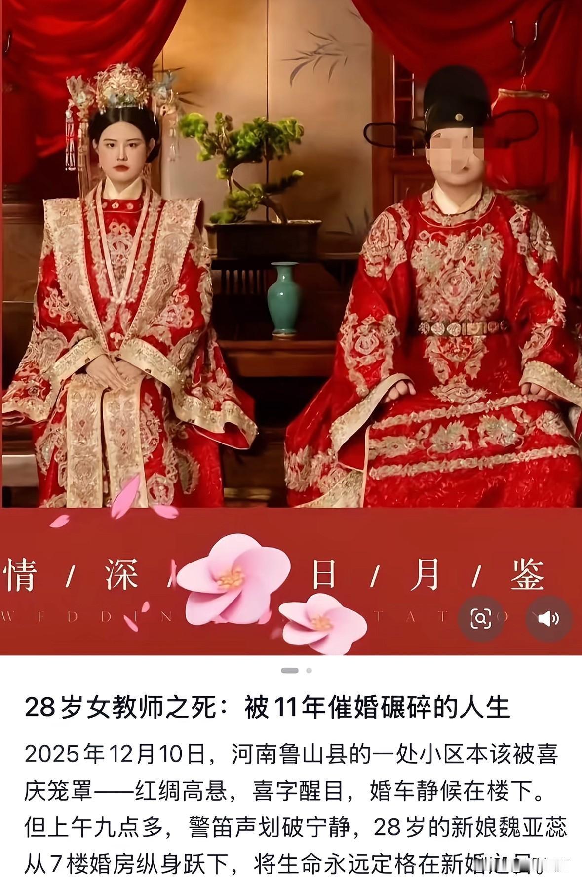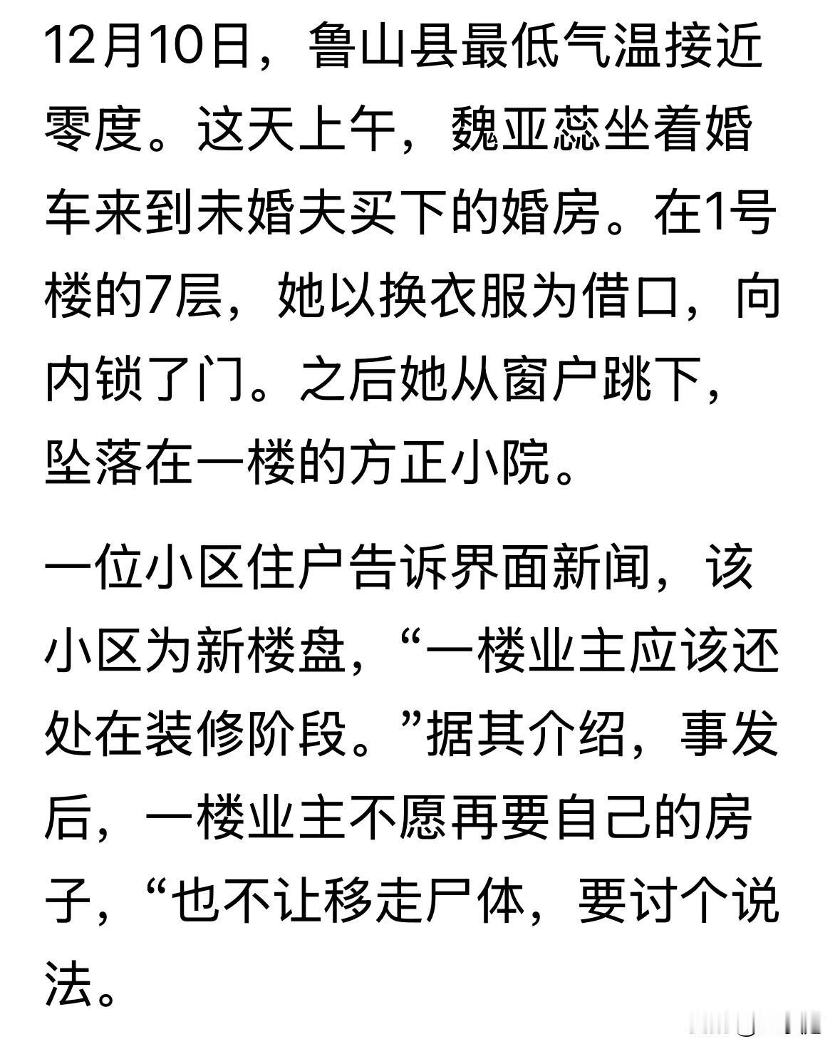 28岁的女教师是从婆家买的婚房跳下的,她坠落在一楼的院子里。那户邻居还没有入住,一个全新的房子就出了这样的事情,所以,他们现在都不想要那个房子了。 悲剧发生在12月10日,当天的情况已有媒体详细报道。 事情的经过大概如下: 那天上午,魏老师同父母吵了一架,情绪很不好,但还是从娘家坐着婚车来到了婆家准备的婚房里。她以换婚纱为由,把房门反锁了。9点多钟,她在朋友圈发了一篇长文,而后从7楼的房间窗户一跃而下! 悲剧发生后,据其工作地的同事透露:原来,魏老师早在结婚前一天就后悔了,她在朋友圈发布了取消婚约的通知。 但第二天,婚礼还是照常举行了。只是谁也想不到,大喜之日会变成了那样的结局! 这个悲剧,于男女双方来说,无疑都是惨重的! 其次,一个无辜的业主也平白无故遭受了重大损失。 因为,魏老师的遗体坠落在一楼的院子里!而麻烦的是,那个业主正处在装修阶段,还没来得及搬进新房。站在他的角度,一个好好的新房子,莫名其妙就变成了这样,心里自然也是不能接受的! 毕竟,发生了那样的事情,继续住那个房子可能过不去心里那坎,不住的话,转售出去价格也会受到一定影响。 现在,那个业主坦言自己都不想要那个房子了,所以,接下来,魏老师的家人很有可能还要面临一定的赔偿问题![祈祷][祈祷][祈祷] 其实啊,魏老师终究还是太冲动了。她不想嫁给那个男人,可以想别的办法终止婚礼,没必要用生命的代价啊! (信息源:界面新闻)