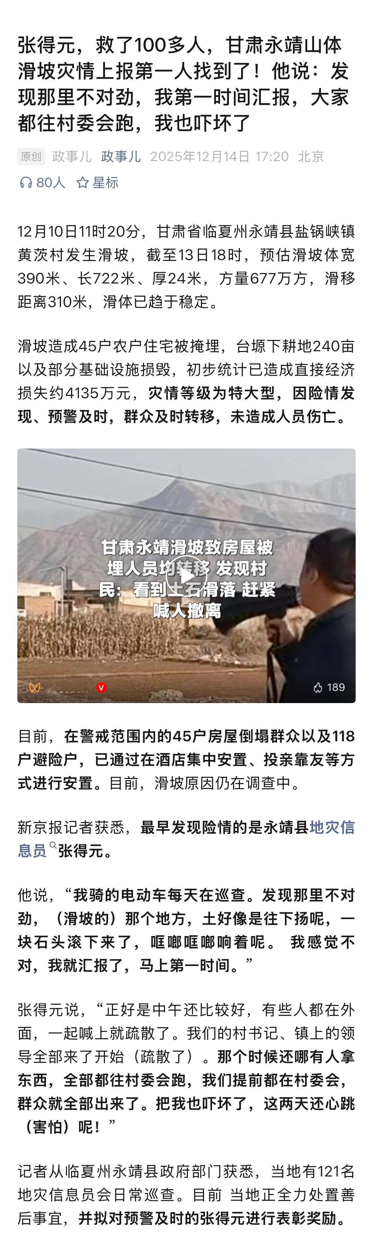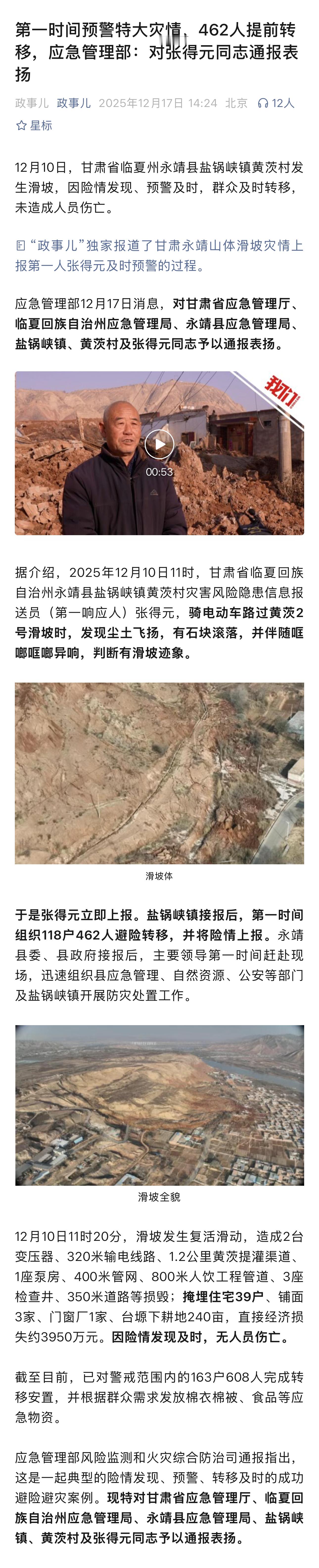 功德无量啊,这才是值得关注的好人好事温暖的中国人 12月10日,甘肃省临夏州永靖县盐锅峡镇黄茨村发生滑坡,因险情发现、预警及时,群众及时转移,未造成人员伤亡。应急管理部对甘肃省应急管理厅、临夏回族自治州应急管理局、永靖县应急管理局、盐锅峡镇、黄茨村及张得元同志予以通报表扬。
