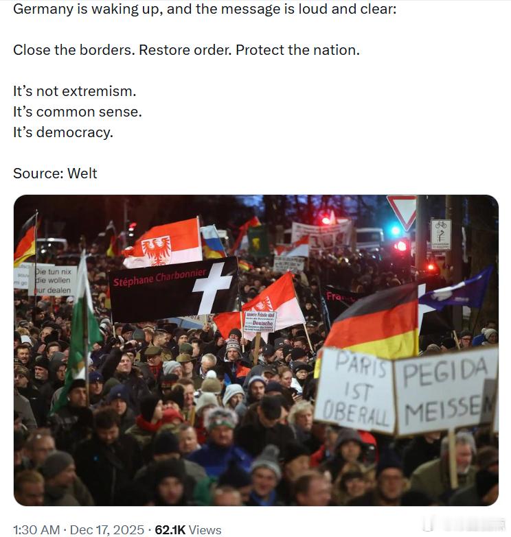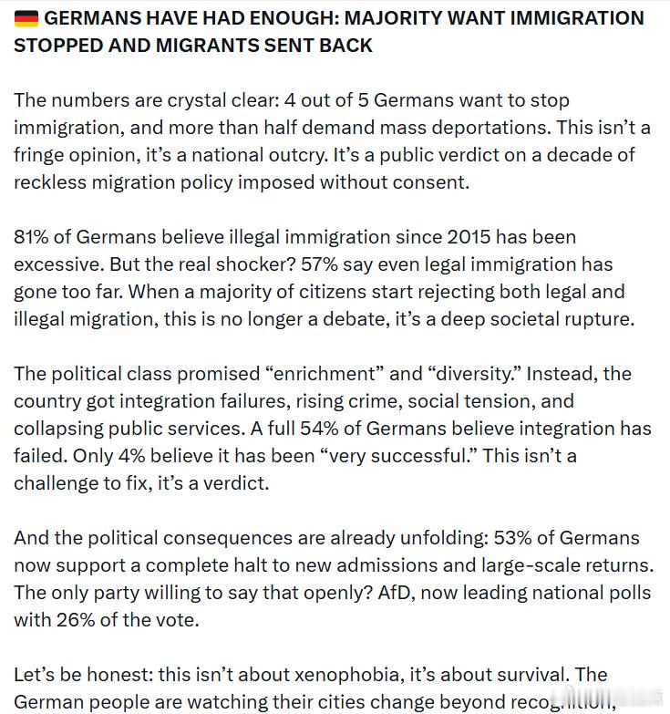 德国人已经受够了:多数人希望停止移民并将移民送回原籍数据一目了然:五分之四的德国人希望停止移民,超过一半的人要求大规模遣返。这不是边缘观点,而是一场全国性的呼声。这是公众对十年来在未经同意的情况下强行推行、鲁莽移民政策的裁决。81%的德国人认为,自2015年以来的非法移民数量过多。但真正令人震惊的是:57%的人表示,连合法移民也已经过头了。当大多数公民开始同时反对合法与非法移民时,这已不再是一场辩论,而是一道深刻的社会裂痕。政冶阶层曾承诺“丰富性”和“多样性”。结果却是:融合失败、犯罪上升、社会紧张,以及公共服务体系的崩溃。整整54%的德国人认为融合已经失败,只有4%的人认为“非常成功”。这不是一个需要修补的问题,而是一份裁决书。政冶后果已经开始显现:53%的德国人如今支持全面停止新的接纳并进行大规模遣返。唯一敢公开这样表态的政党?德国选择党(AfD),目前在全国民调中以26%的支持率领跑。说句实话:这不是关于仇外心理,而是关于生存。德国人民眼睁睁看着自己的城市变得面目全非,声音被压制,合理关切被抹黑为“极右翼”。但现实不可能永远被婶查。德国正在觉醒,信息清晰而响亮:关闭边境。恢复秩序。保护国家。这不是极端主义。这是常识。