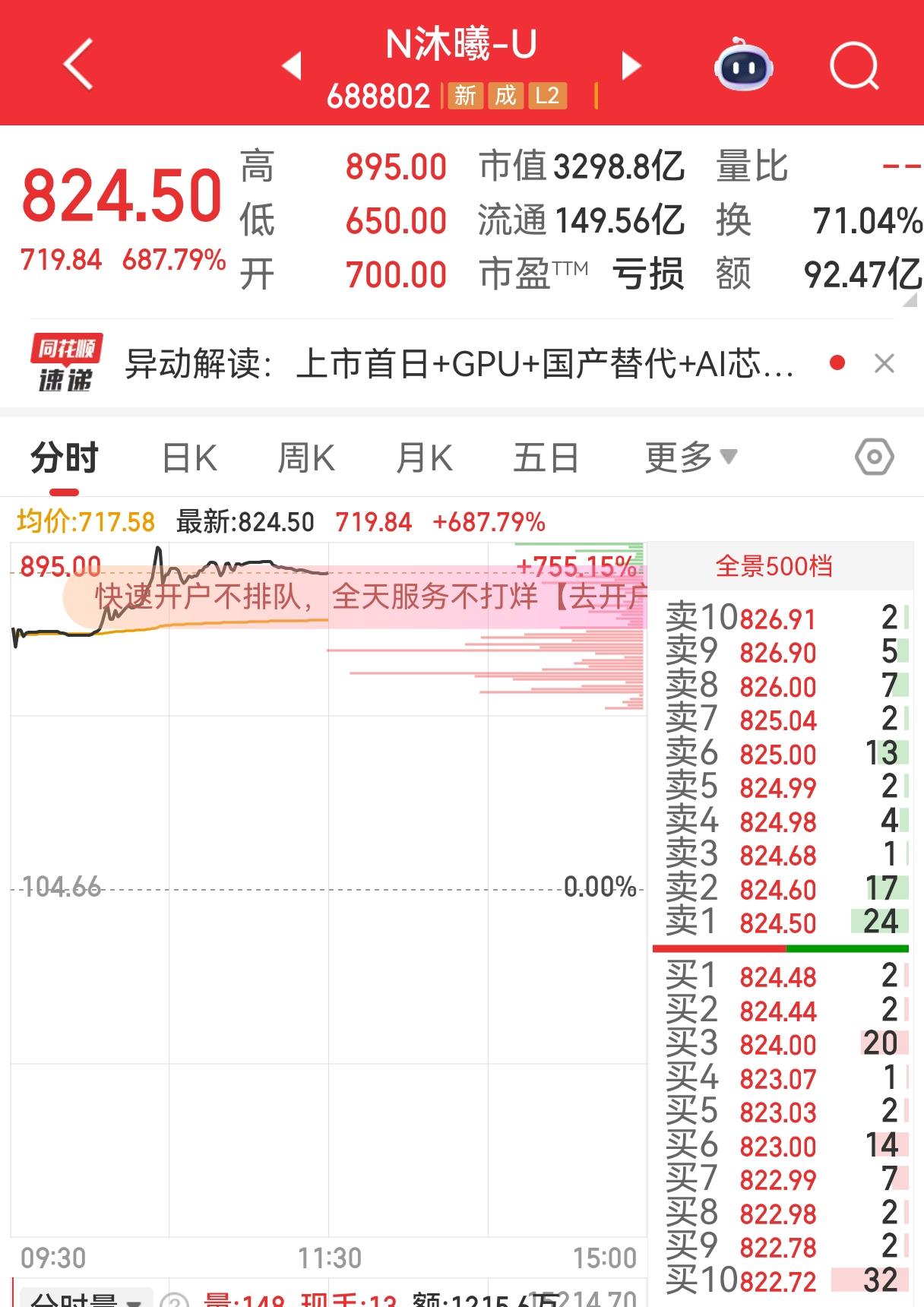 今日(12 月 17 日),股市再度书写历史,沐曦股份荣膺 A 股最赚钱新股。它于今日成功登陆上交所科创板,发行价定格在 104.66 元/股。上市首日,其股价大幅高开,盘中涨幅一度逾 700%,最高触及 895 元,较发行价飙涨 687.8%。理论上,中一签最高可盈利 39.5 万元,一举超越此前上市的摩尔线程,成为 A 股全面注册制以来最赚钱的新股。