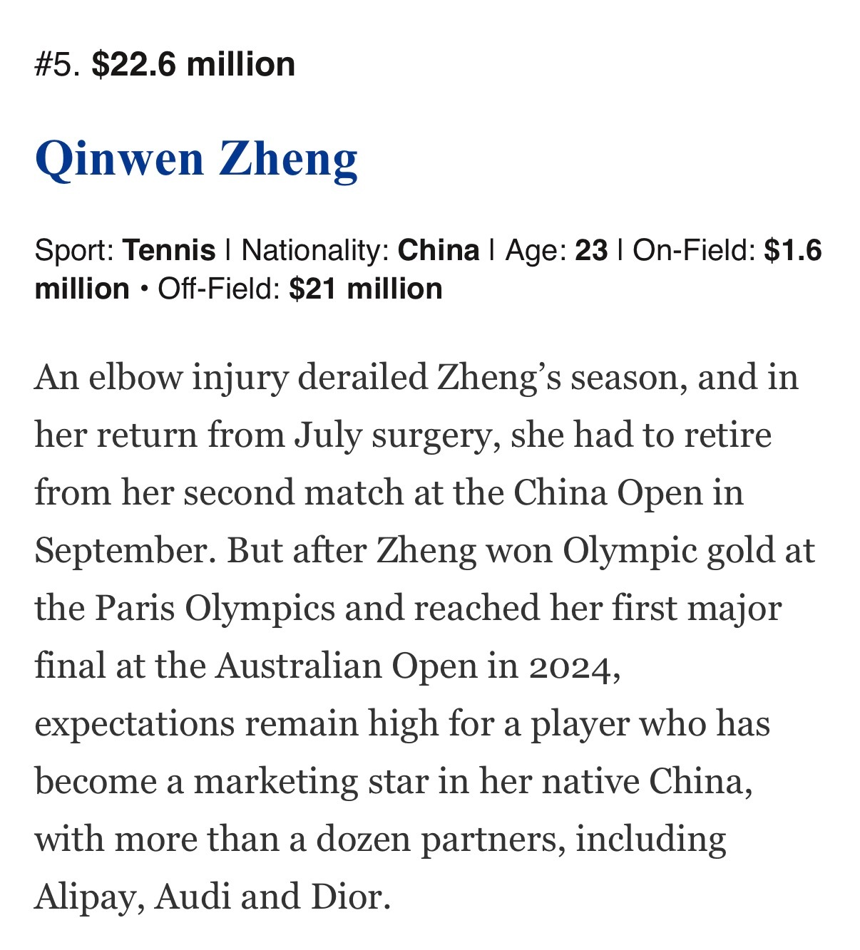 郑钦文福布斯收入榜全球第5 美国《福布斯》公布了2025年全球女子运动员收入榜,郑钦文以2260万美元排名第五,与此前《Sportico》的榜单顺序一致,高芙、萨巴伦卡、斯维亚泰克和谷爱凌位列前四位1️⃣ 高芙3300万(奖金800万+赞助2500万)2️⃣ 萨巴伦卡 3000万(奖金1500万+赞助1500万)3️⃣ 斯维亚泰克2510万(奖金1010万+赞助1500万)4️⃣ 谷爱凌 2310万(奖金10万+赞助2300万)5️⃣ 郑钦文2260万(奖金160万+赞助2100万)6️⃣ 凯斯 1340万(奖金440万+赞助900万)7️⃣ 内莉-科达1300万(奖金300万+赞助1000万)8️⃣ 大坂直美 1250万(奖金250万+赞助1000万)8️⃣ 莱巴金娜 1250万(奖金850万+赞助400万)🔟 佩古拉 1230万(奖金530万+赞助700万)网球talking大会