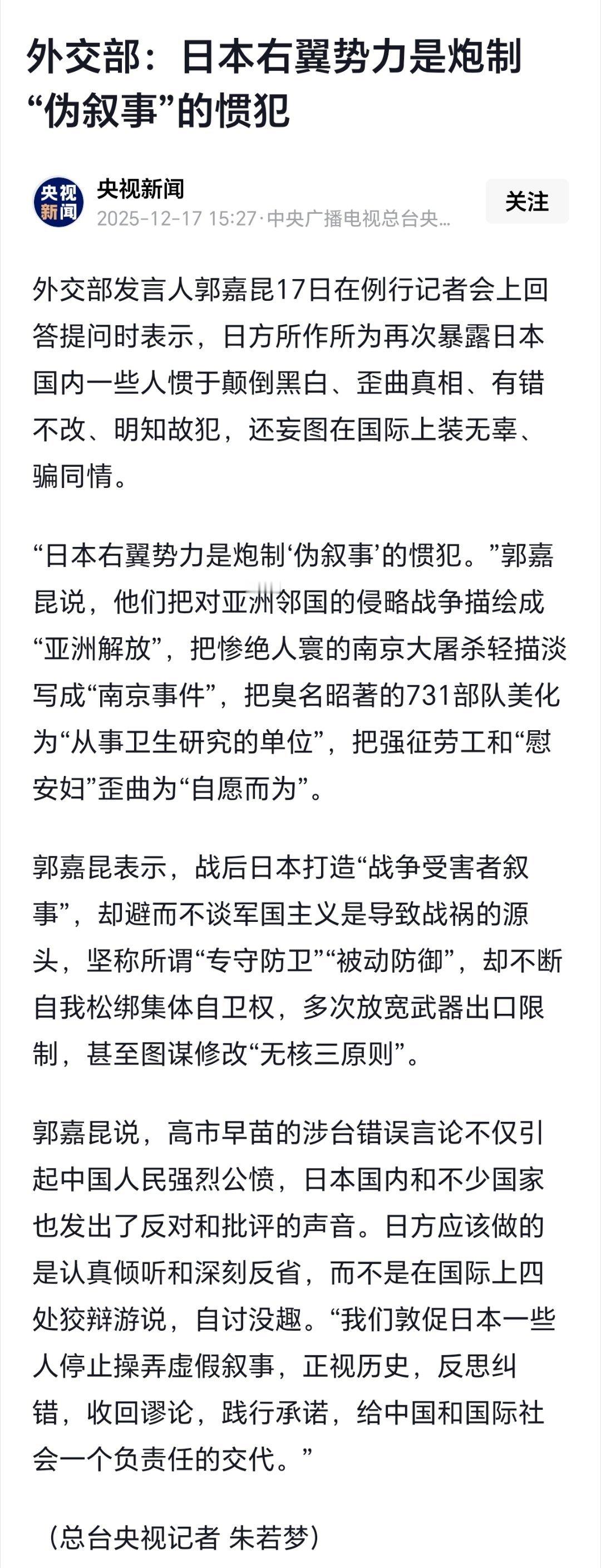 日本右翼势力是炮制伪叙事的惯犯外交部:日本右翼势力是炮制“伪叙事”的惯犯