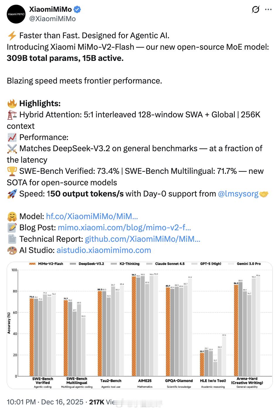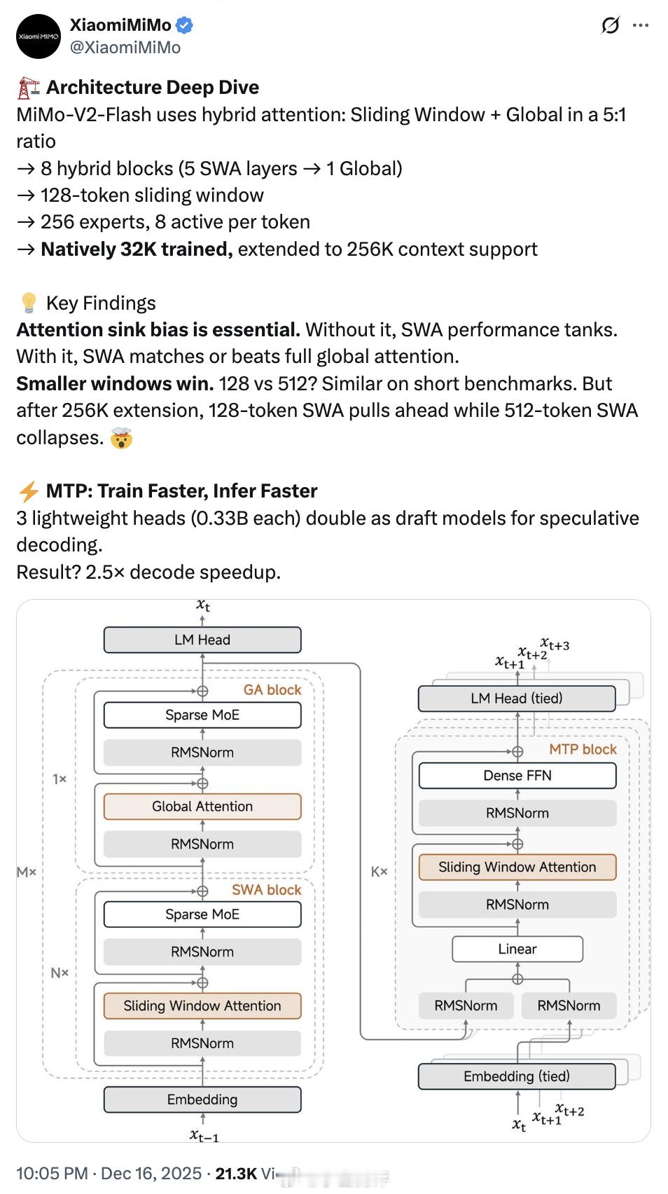 小米发布最新MiMo大模型 小米发布Xiaomi MiMo-V2-Flash全新开源MoE模型,总参数量309B,活跃参数量15B,目前有网页可以体验,大家可以试试~