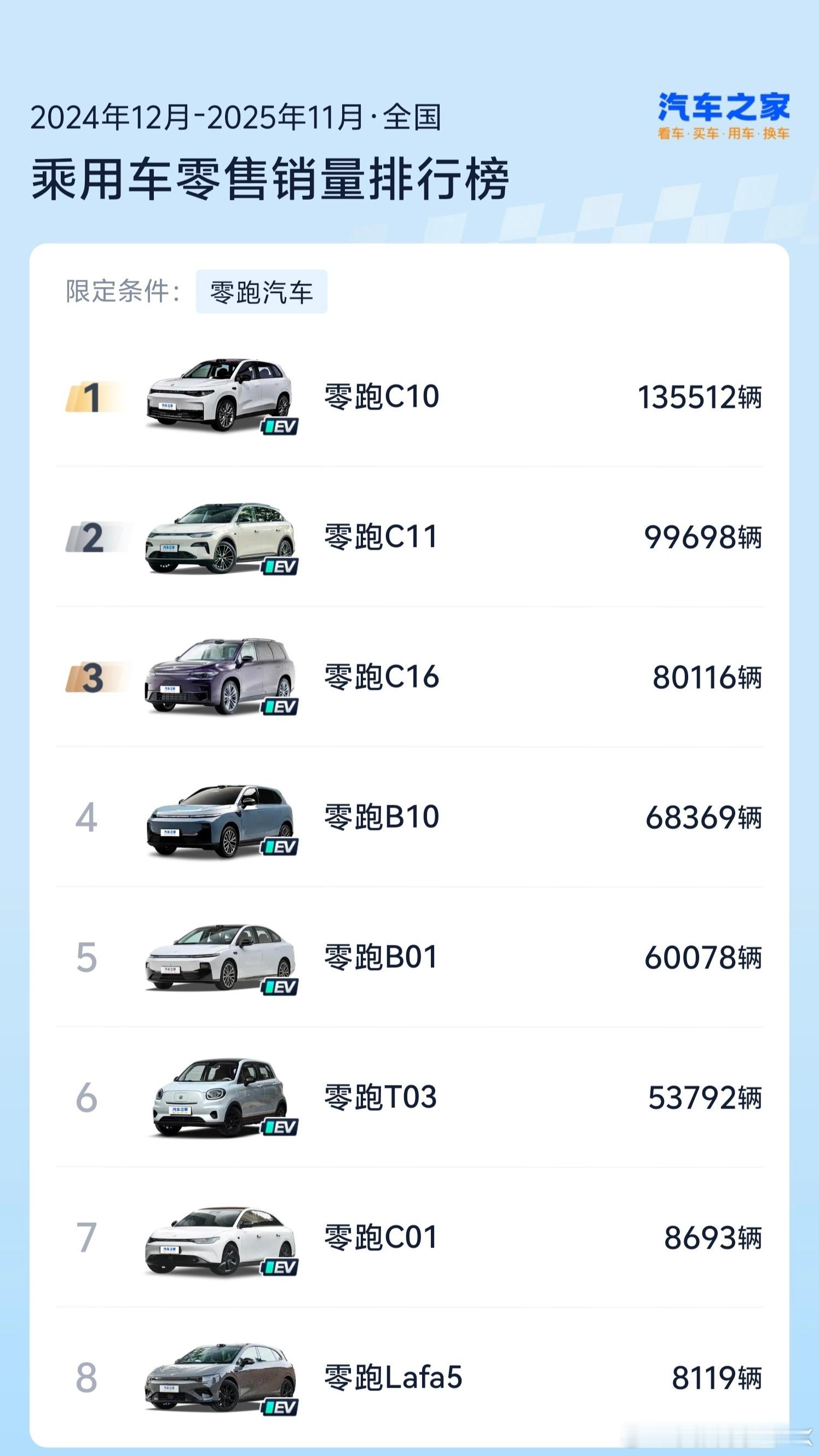 今天和同事聊到零跑,觉得这牌子挺神奇的。同事并不是很看好 Lafa5,但没想到这家伙上市第一个月干出去 7000 多台。我是觉得一个品牌核心产品集中在 10-20 万,甚至是 10-15 万,还能做到不互相打架…零跑今年前 11 个月卖了 50 多万,明年往下走有个 A10 往上走有 D19 和 MPV…主力市场吃满,中高端再站稳的话,有点期待能打到什么高度了新能源汽车零跑汽车