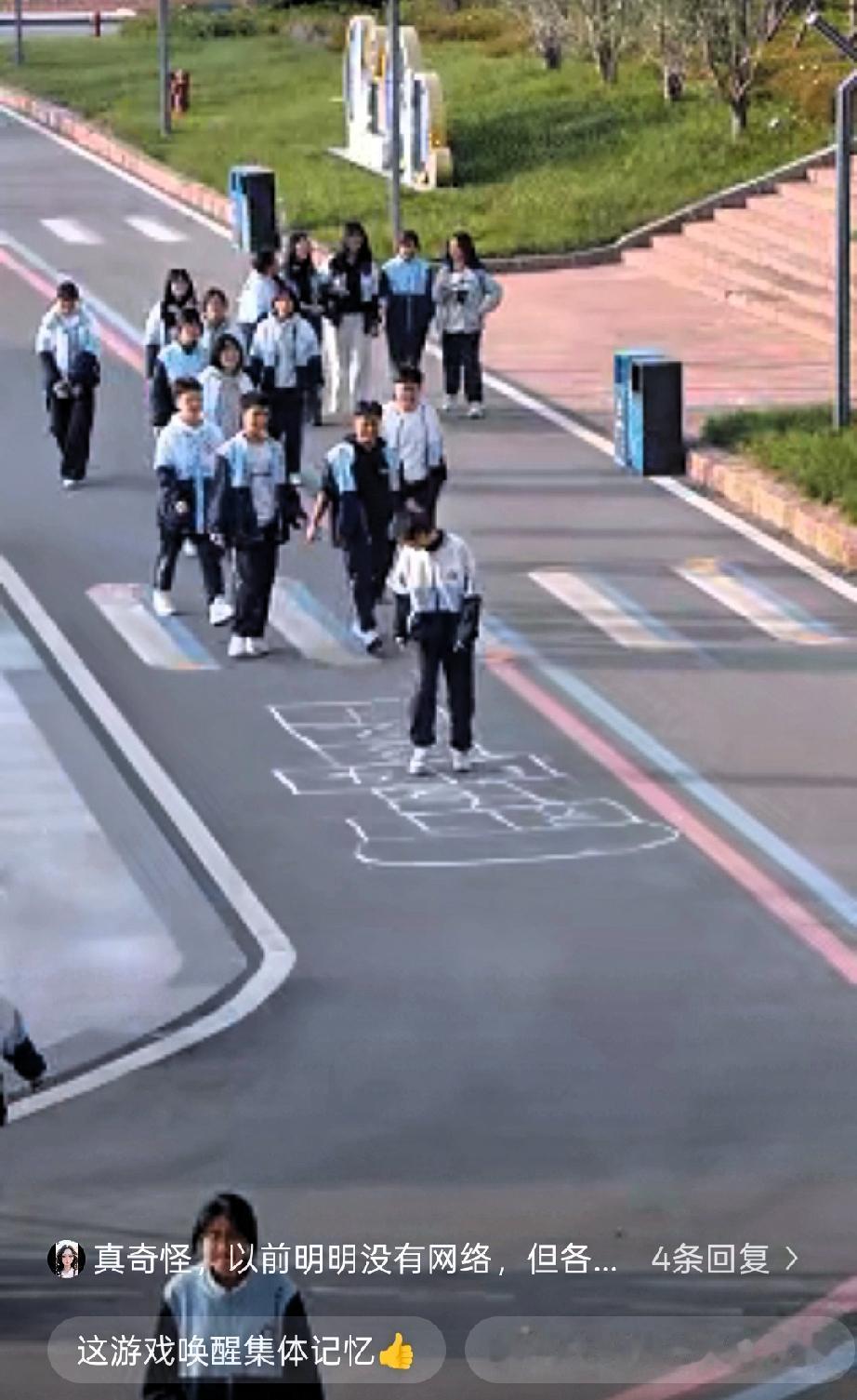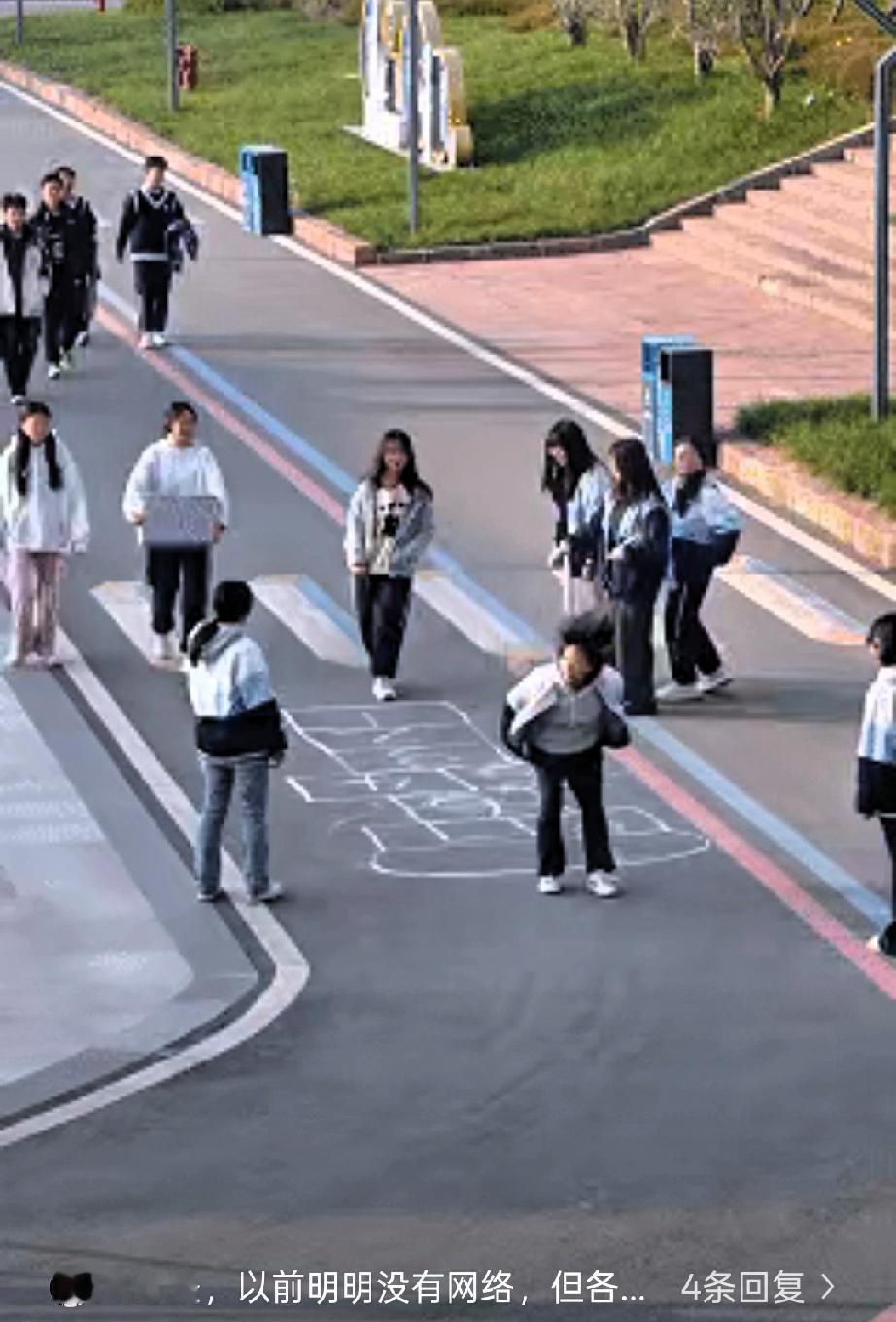 “解释不清了!”四川德阳,两个高中女生趁着课间,在上课的必经路上,用粉笔画了个"跳房子"的游戏,让整个校园多了一份特别的温情。 下课铃一响,路过的男生眼睛瞬间亮了,单脚起跳、双脚落地、转身捡石子,一套动作行云流水,围观的同学跟着起哄,指点着“你踩线了”“该单脚跳”,上课铃催着人散去,粉笔格子却静静留在原地,等着下一个驻足的人。 没过多久,巡逻的保安大叔路过,脚步顿了顿,四下张望确认没人注意,才小心翼翼抬起腿跳了起来。 动作有点僵硬,却一步不落格外认真,跳完还悄悄拍了拍裤腿,嘴角带着浅浅的笑意,转身又变回了那个认真巡逻的保安。 再后来,几位老师结伴走过,看到地上的格子也来了兴致,慢慢悠悠跳了起来。 她们跳得很慢,每一步都像在回味什么,跳到最后一格时,还特意停了下来,望着前方出了神,仿佛透过那些粉笔印,看到了自己小时候在巷口跳格子的模样。 这哪是跳房子啊,分明是借着地上的粉笔印,踩回了那些没有成堆作业、没有工作压力,只靠一块空地、一根粉笔、一颗石子就能玩一下午的旧时光。 现在的孩子捧着手机平板,指尖划过屏幕就是一个虚拟世界,少了些我们小时候蹲在地上画格子的简单乐趣。可那些刻在骨子里的游戏规则,那些纯粹的快乐,从来没被真正忘记。 就像网友说的,他们好像跳错了,因为没有跳回去;又好像没跳错,因为我们早就回不去了。 长大以后,我们都学会了朝着人生的前路稳步走,却再也没能踩着粉笔格子,跳回那个无忧无虑的童年。 原来不管多大年纪,心里都住着一个爱跳格子的小孩,那些被时光藏起来的快乐,只需要一个小小的契机,就能瞬间被唤醒。