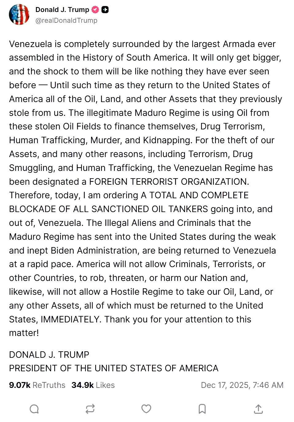 美国总统老特在“真实社交”上写道:“委内瑞拉被有史以来集结的最大规模的舰队完全包围,这支舰队只会越来越大。对他们来说,这将是前所未有的打击——直到他们把之前从我们这里窃取的所有石油、土地和其他资产都归还给美国为止。”“美国绝不允许敌对政权夺取我们的石油、土地或任何其他资产,所有这些资产都必须立即归还给美国。” 啥叫赤果果的抢劫,这就是。老特这是一点儿都不装了,直白地说对委内瑞拉动武,并不是为了禁毒和争取民主,而是为了石油和土地。