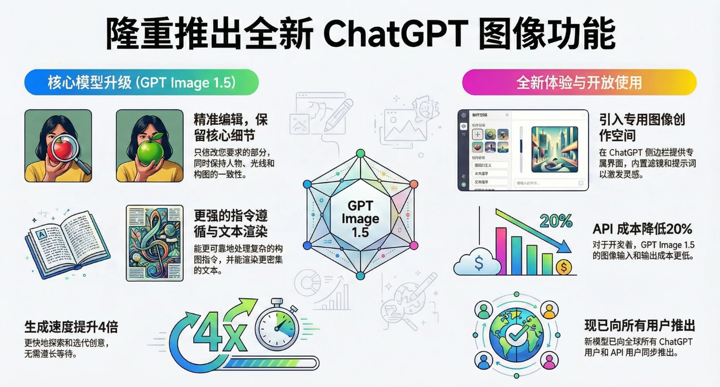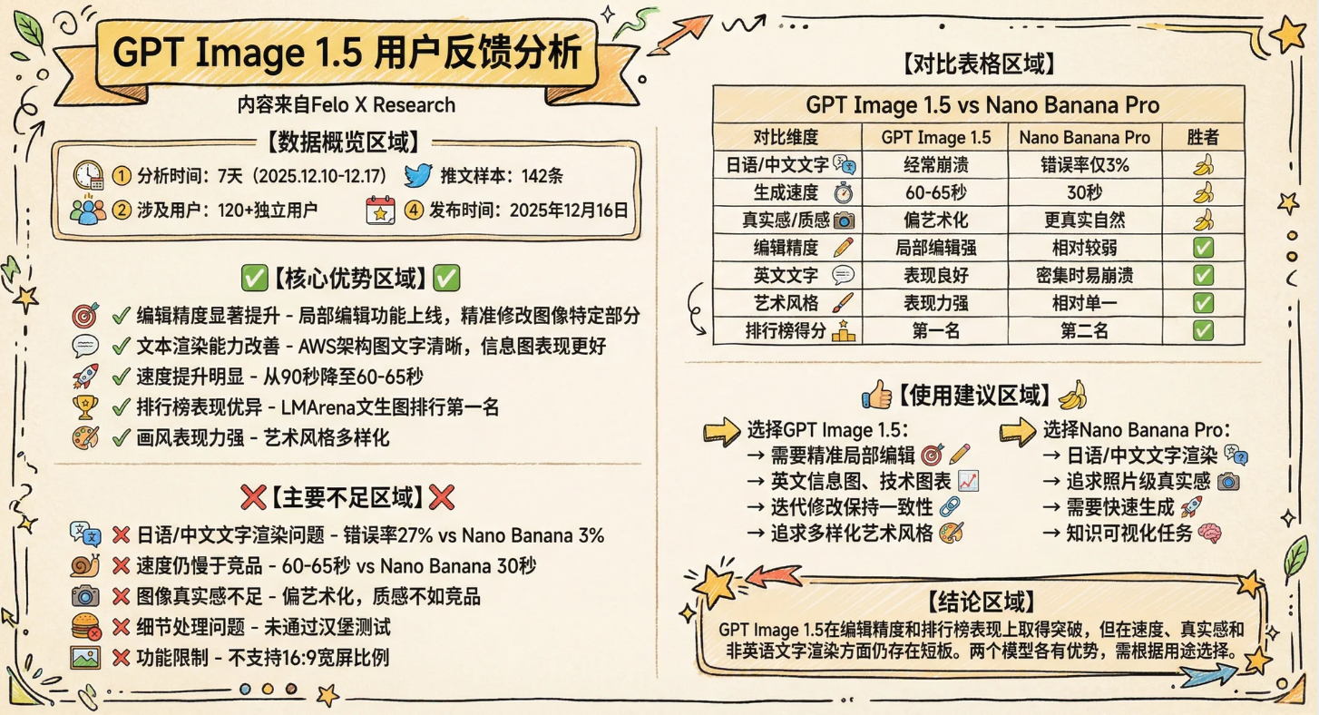 OpenAI 今天上线了 GPT-Image 1.5,用下来最大的感受是:这次不是拼生图能力多强,而是开始认真解决编辑的问题。它最大的优势还是改图能力,局部精准编辑真的很稳,适合反复修细节。对于一些英文文字表现也很强,做英文海报、PPT、信息图基本不翻车。但短板也很明显,中文注释还是不太给力,错误率相对比较高,中文信息图不太建议用;整体质感还是像干净的素材图,真实感不如 Nano Banana。再加上不支持 16:9,如果大家用来做视频封面会比较难受。一句话:改图选 GPT-Image 1.5,出片选 Nano Banana。