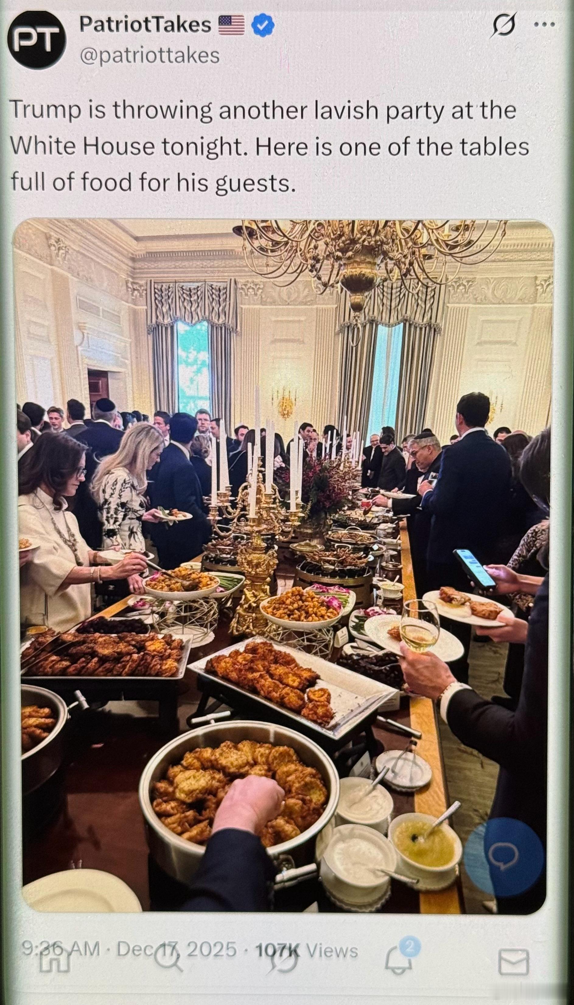 特朗普今晚在白宫举办另一场奢华派对。这是其中一桌为他的客人准备的食物。