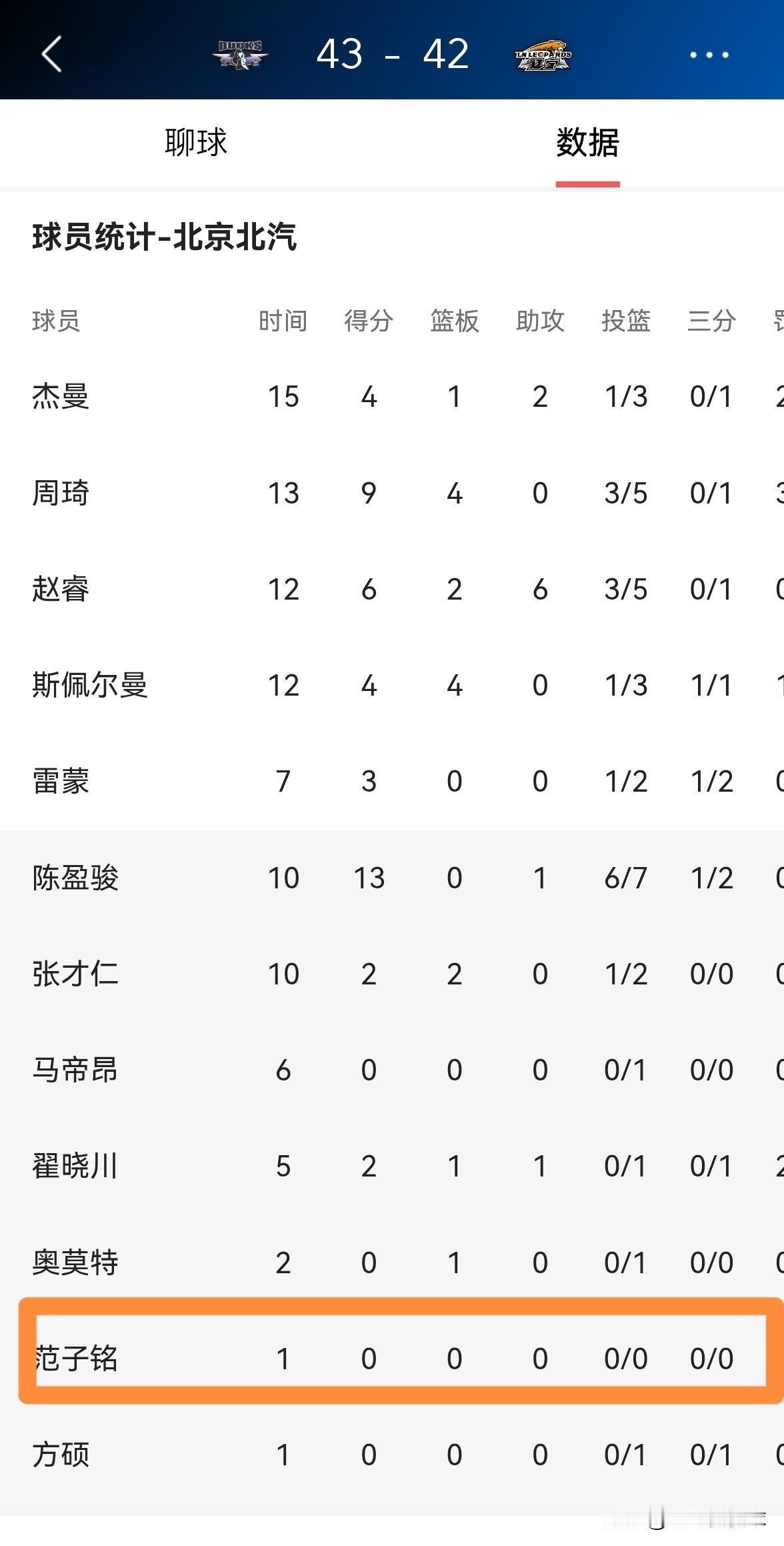 北京北汽大将范子铭真是无药可救了!在今天进行的北京北汽和辽宁本钢的焦点战中,目前双方的上半场比赛已经结束,北京北汽以43:42领先对手。在上半场比赛中,范子铭破天荒的获得了1分钟的上场时间,没有出手怒砍0分0篮板0助攻0抢断0盖帽,他的场上正负值为-4。 值得一提的是,在范子铭上场的1分钟里,他成为了辽宁本钢的提款机,导致北京北汽主帅许利民赶紧将范子铭替换下场。