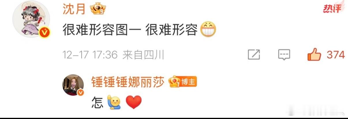 锤娜丽莎分享跟沈月合照沈月回复锤锤:很难形容图一 很难形容沈月锤娜丽莎