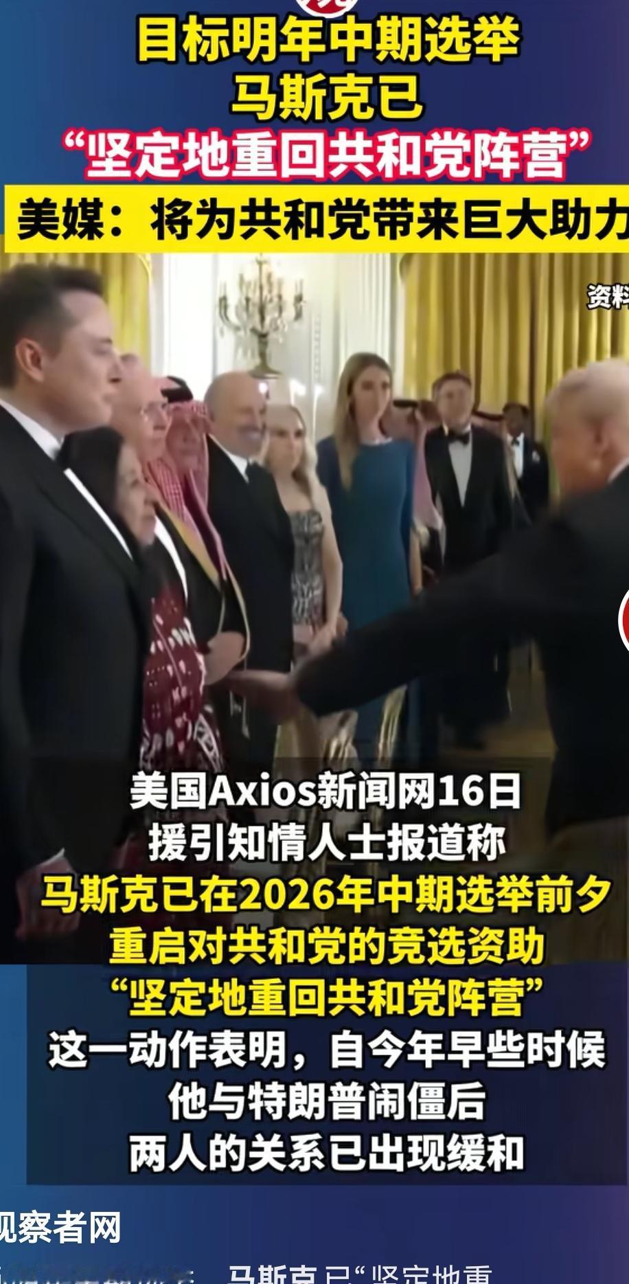 嘿嘿,说一个怪事啊。 美国政府啊,真的有意思。 特朗普现在感觉中期选举有危险了。 又把马斯克拉进了政府了。 为了明年的中期选举马斯克以坚定的回到共和党阵营。 将为美国政府特朗普带来巨大的助力。 而且马斯克并说将在整个2026年选举期内持续投入资金。 作为2024年美国大选的金主马斯克当年捐款总额达到了2.9亿美元。 这些钱都是支持特朗普竞选的。 当然马斯克也成为共和党胜选的关键支持者。 那这一次他不又回到了共和党,又是使特朗普在中期选举。 马斯克准备要掏多少钱呢?这个钱掏少了。恐怕起不了作用。 估计最少有一个多亿吧。不得不说,马斯克翻脸比翻书也快。 都说自己退出共和党了,要成立自己的党。叫什么美国党。 是马斯克还说过不会回去再支持特朗普了。 怎么突然又回去了呢? 还有前几天马斯克在接受记者采访时说。 他说现在的人工智能走的太快了,对世界不利。对人类不利。 前年的时候马斯克可不是这样讲的。 他说要加快AR。要让机器人代替人类工作。 那么突然为什么要说那句话呢? 因为他的机器人已经落后中国了。 美国人不管是任何人说的话,以后都不能全部相信。 对他们有利的时候,他们就会说对他们有利的话。 对他们没有利益的时候,对他们有威胁的时候。那就是换了另一副面孔了。世界首富马斯克