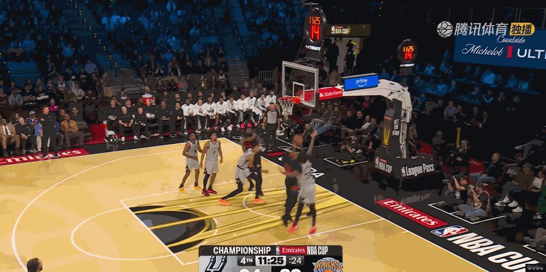 马刺尼克斯末节的一个回合。布朗森运运运没打出什么战术拔了,打铁,米切罗篮板。克拉