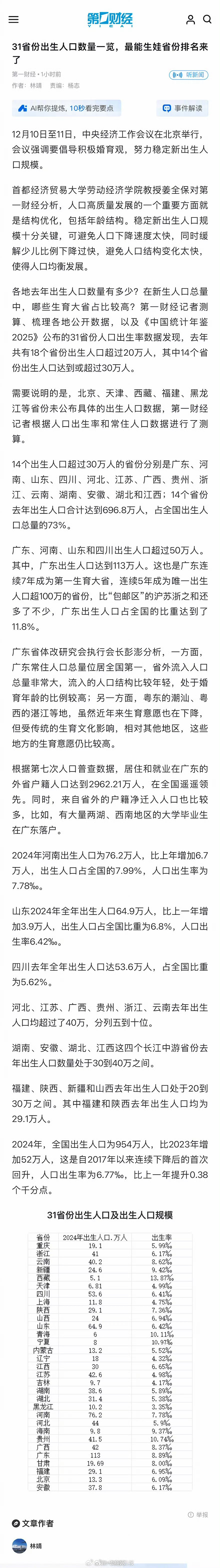 #最能生娃省份排名来了#【#去年18省份出生人口超过20万人# 】12月10日至11日,中央经济工作会议在北京举行,会议强调要倡导积极婚育观,努力稳定新出生人口规模。首都经济贸易大学劳动经济学院教授姜全保对第一财经分析,人口高质量发展的一个重要方面就是结构优化,包括年龄结构。稳定新出生人口规模十分关键,可避免人口下降速度太快,同时缓解少儿比例下降过快,避免人口结构变化太快,使得人口均衡发展。#31省份出生人口数量一览#各地去年出生人口数量有多少?在新生人口总量中,哪些生育大省占比较高?第一财经记者测算、梳理各地公开数据,以及《中国统计年鉴2025》公布的31省份人口出生率数据发现,去年共有18个省份出生人口超过20万人,其中14个省份出生人口达到或超过30万人。需要说明的是,北京、天津、西藏、福建、黑龙江等省份未公布具体的出生人口数据,第一财经记者根据人口出生率和常住人口数据进行了测算。 #明年生娃基本不用再花钱#31省份出生人口数量一览,最能生娃省份排名来了