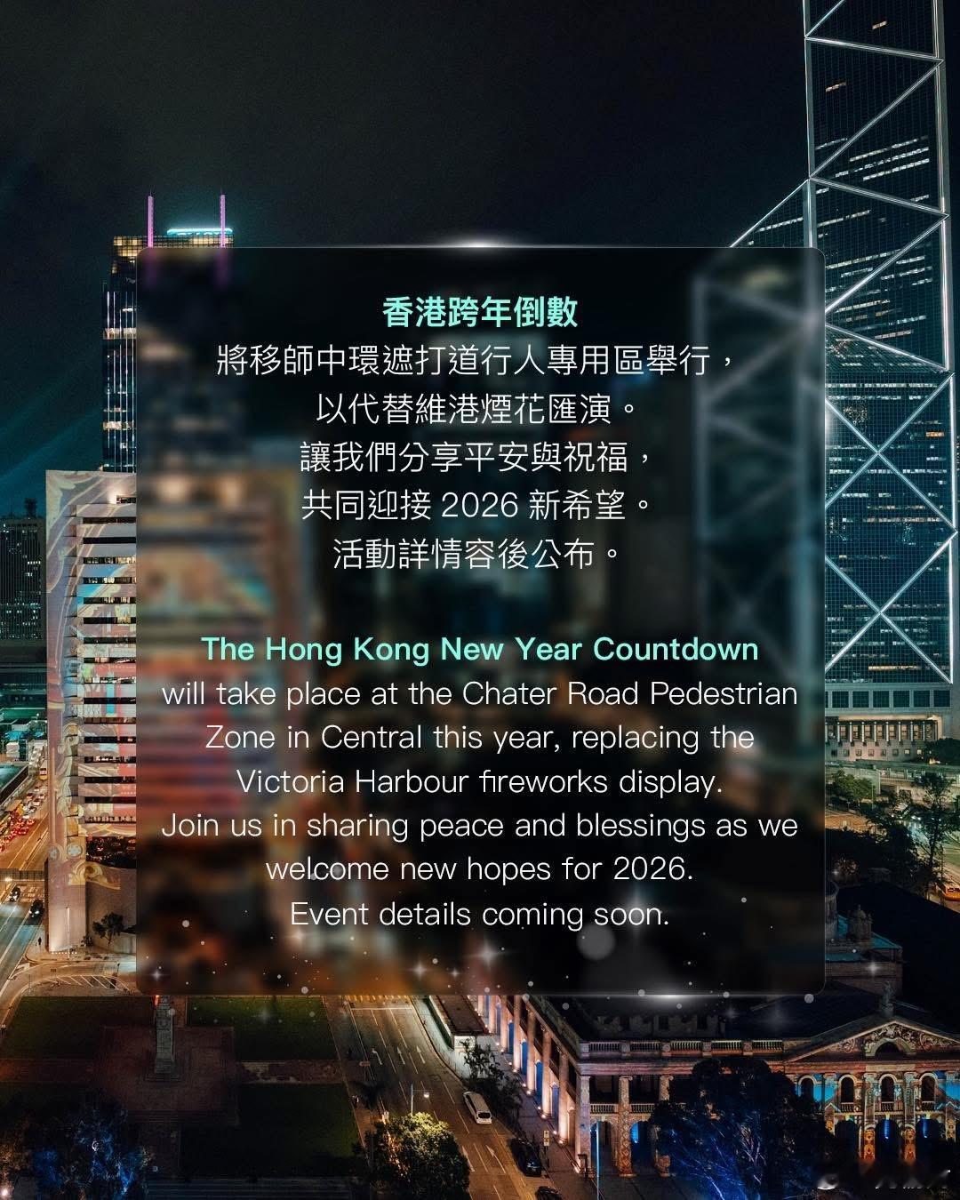 香港跨年倒数特别安排 遮打道倒数取代维港烟花香港取消维港跨年烟花港闻热点观点 香港旅游发展局公布,今年12月31日嘅香港跨年倒数,将移师中环遮打道行人专用区举行,以取代维港烟花汇演。