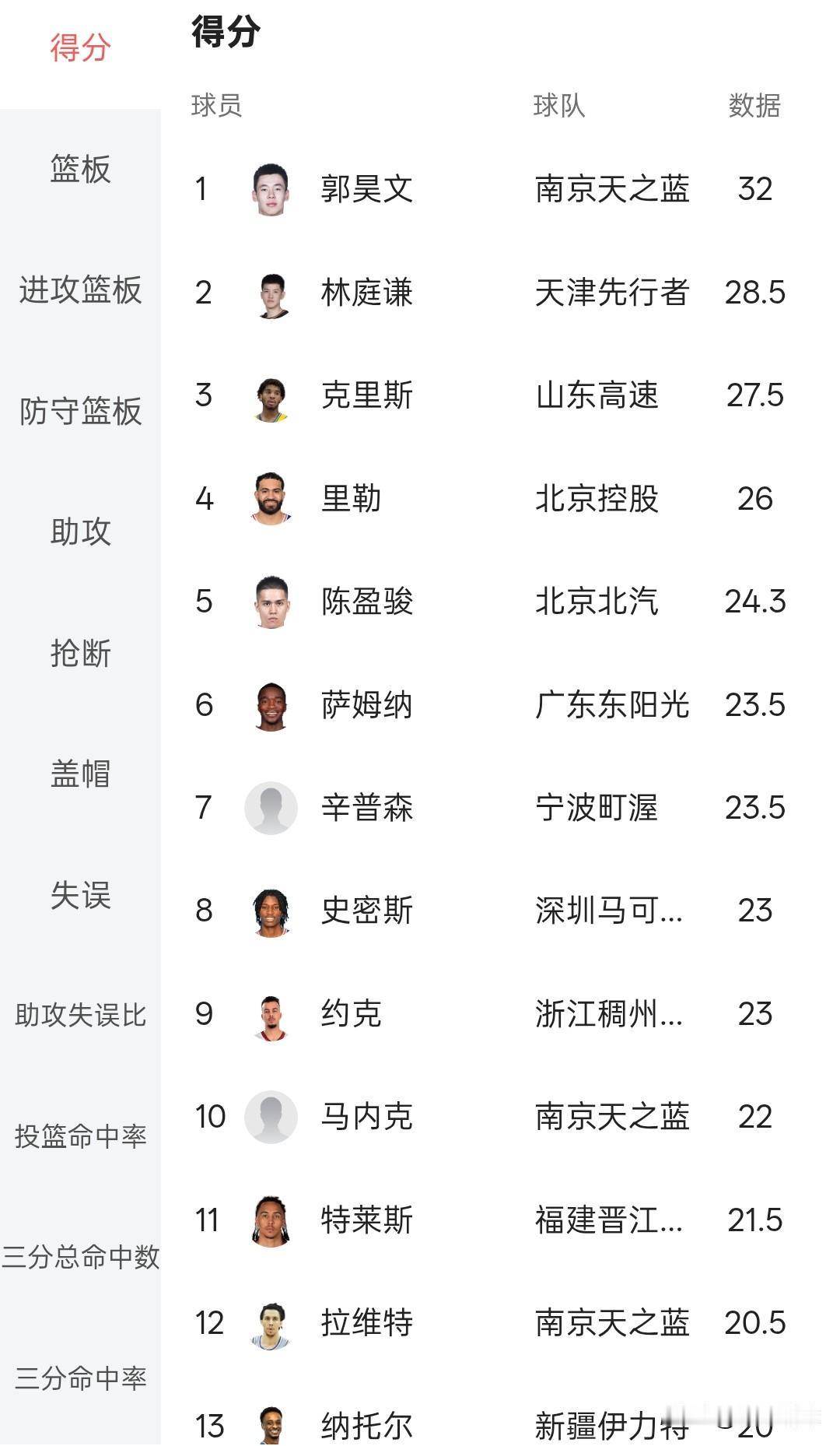 CBA得分榜,前五名里三名本土球员,这在以往赛季里是很少见的,以往赛季得分榜靠前都是外援,本土球员开始决定比赛胜负。 同曦队郭昊文场均32分,天津队林庭谦场均28.5分,北京队陈盈骏场均24.3分。