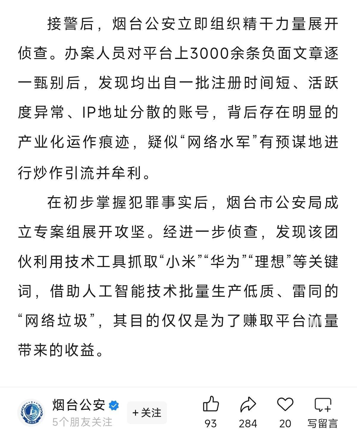 仅仅是为了赚取平台流量带来的收益,12名嫌疑人操纵超过8000个违法网络账号,赚取资金超过百万元。黑产操纵8000余个账号抹黑小米华为理想所以品牌流量越大,背后越会出现这种莫名其妙的水军。而我们普通人做的就很简单,八个字“独立思考,明辨是非”。这八个字说难不难,但说简单也不简单。现在很多事情发生后,有不少人习惯人云亦云,但有可能这件事背后就会有这种“黑水军”在操纵。独立思考,既然关注这件事情,就要了解所有官方公布的信息再做评论。明辨是非,既然想发表观点,那就要完整的了解事情经过,再发表看法,而且不被网络上形形色色的消息转移。抵制网络谣言,需要大家理性判断,共同监督,一起让网络环境恢复清朗。