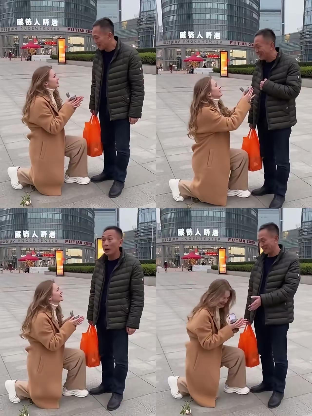 老大爷被这个漂亮的俄罗斯小姐给整蒙了,这样的单腿下跪是求婚还是求财,由于语言不通,大爷不知所措,直到女孩手捧戒指大爷才明白,原来是这个小美女向大爷求婚,大爷做梦都没想到美事从天而降,立刻答应了这门婚姻大事。